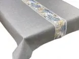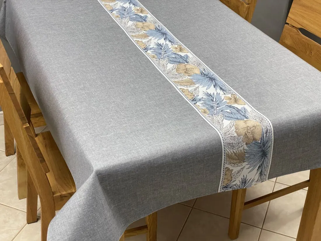 Minimalistyczny szyk i szlachetny popiel – Twoje nakrycie stołu zyska nowy wymiar dzięki unikalnej, żakardowej aplikacji biegnącej przez środek blatu.