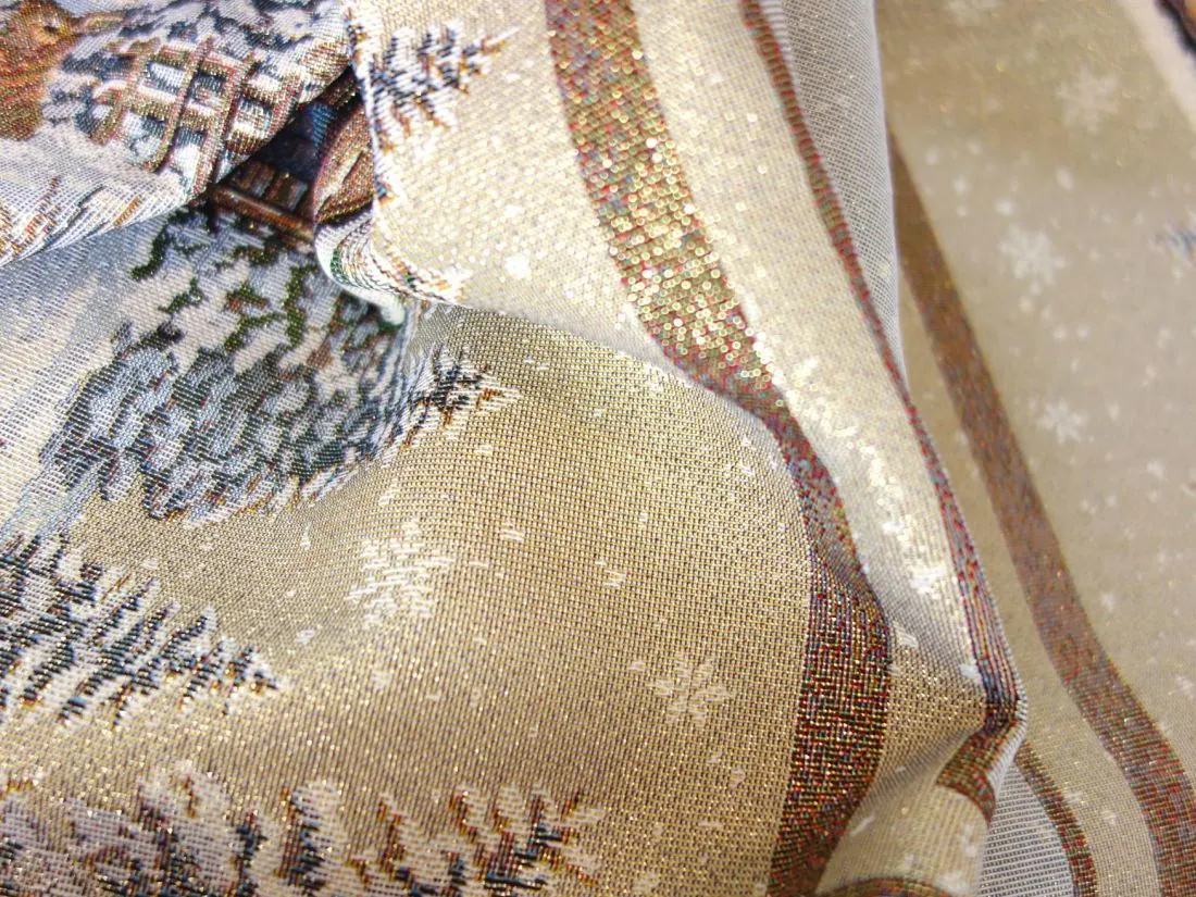 Obrus Gobelinowy Świąteczny Boże Narodzenie to wyjątkowy dodatek, który nada magicznego uroku każdemu wnętrzu w okresie świątecznym. Wykonany z hiszpańskiej tkaniny o składzie 25% bawełna, 70% poliester i 5% poliakryl, ten obrus charakteryzuje się wysoką jakością i trwałością. Tkanina jest tkana żakardowo, co nadaje jej wyjątkową fakturę i wzornictwo. Dodatkowym atutem poszewki jest złota nitka wpleciona w tkaninę gobelinową.Niezwykłe wzory użyte na tej serwecie nawiązują do tradycji gobelinów, które kiedyś ozdabiały ściany w domach. Teraz możesz cieszyć się tymi pięknymi motywami na swoim stole lub komodzie. Obrus Gobelinowy Świąteczny Boże Narodzenie jest idealny do umieszczenia w salonie lub kuchni, gdzie jego obecność odmieni całe wnętrze i stworzy magiczną atmosferę.Tkanina jest gruba , co sprawia, że jest praktyczna i łatwa w utrzymaniu. Różnorodność wzorów na bieżnikach gobelinowych zaspokoi gust każdego, kto pragnie wprowadzić do swojego domu niepowtarzalny, magiczny, sielski klimat. To doskonałe rozwiązanie, aby odmienić wnętrze na czas świąt, dodając mu wyjątkowego charakteru.