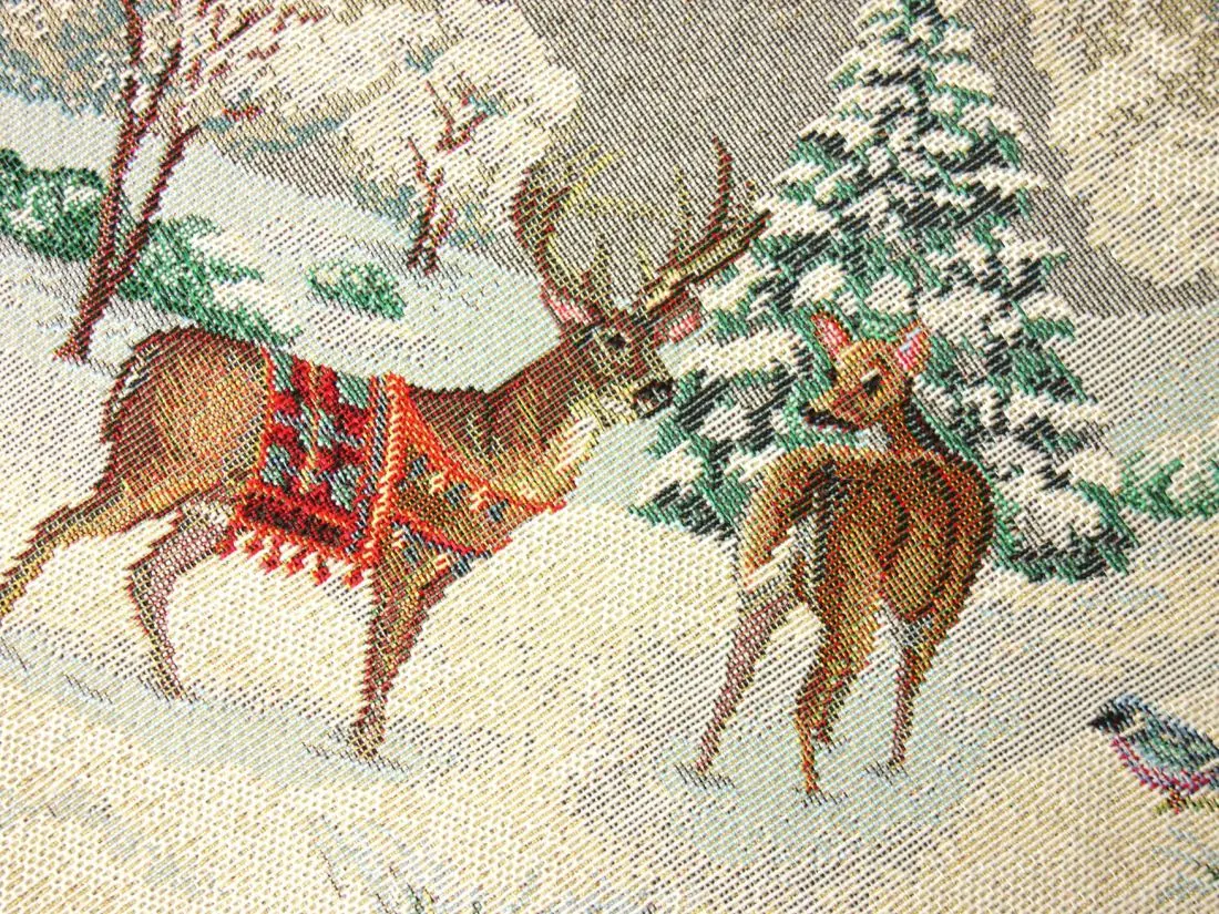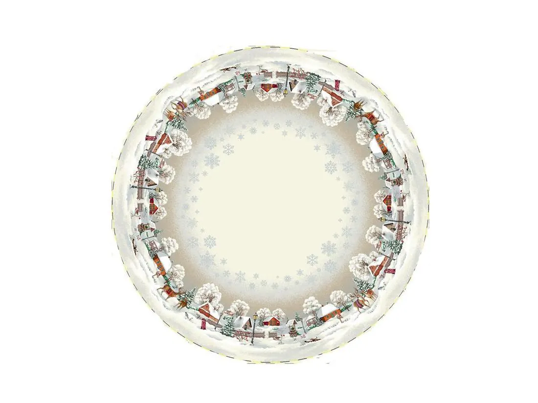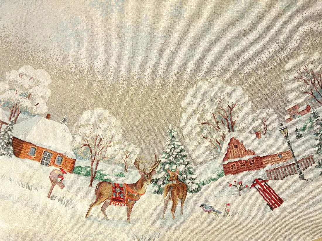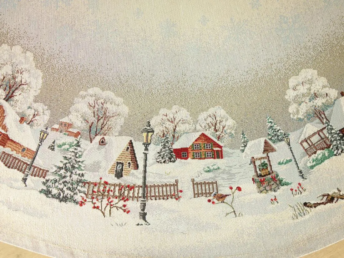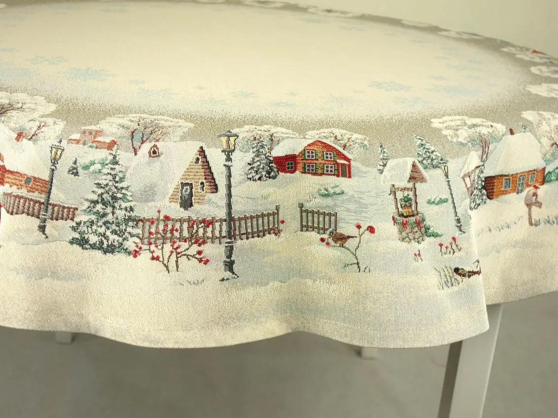 Obrus gobelinowy świąteczny śr. 140 cm święta chatki, jeleń, sarenka zimą nr sw 287 SlodkieSny okrągły