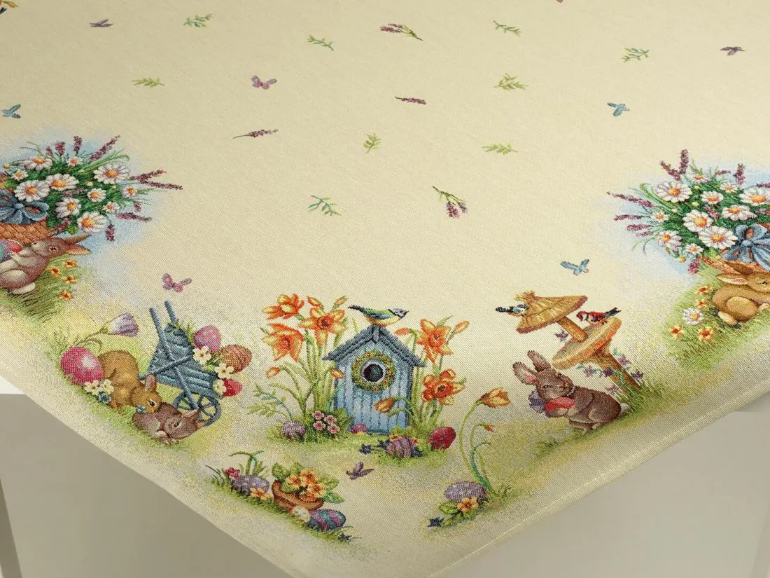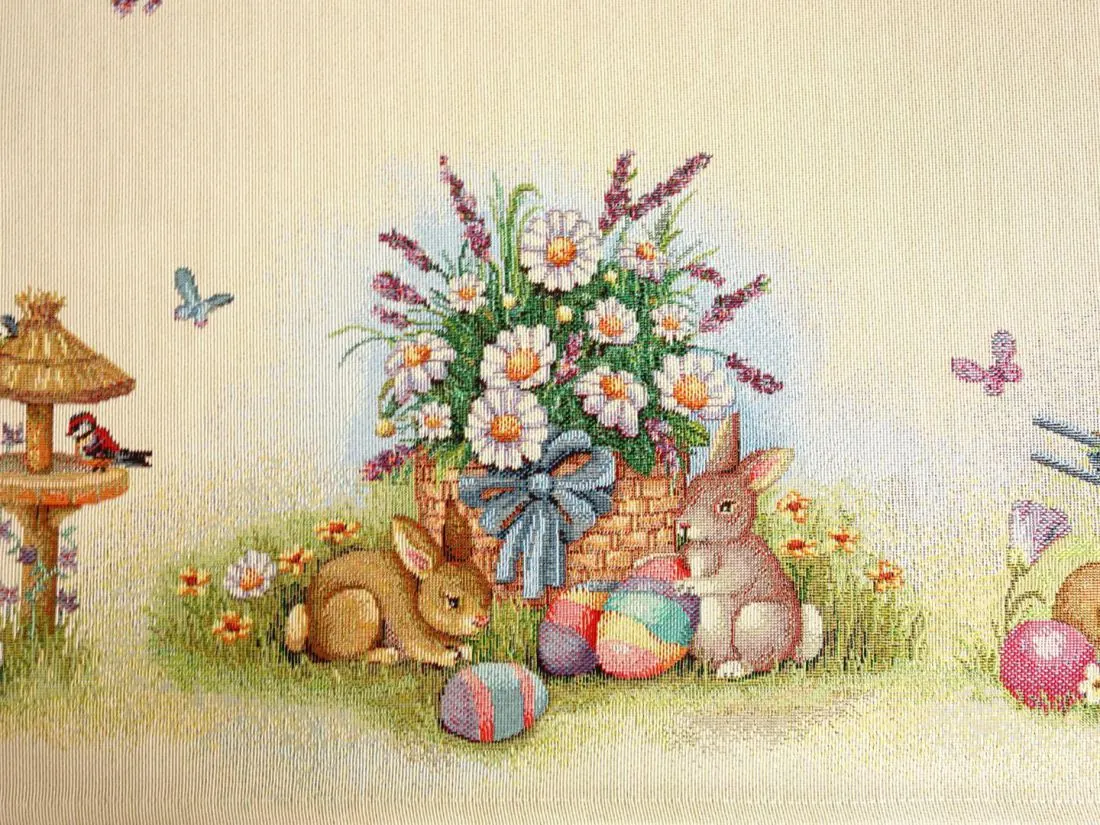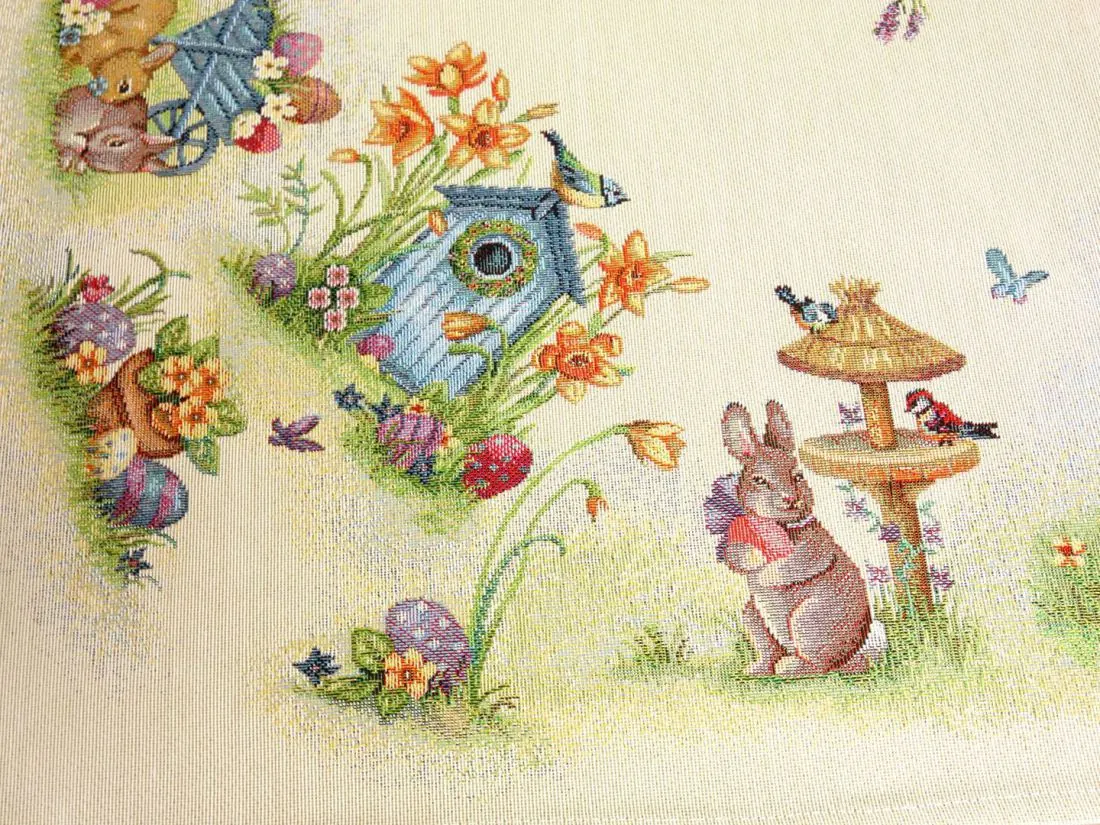 Wielkanocny dekoracyjny obrus gobelinowy w rozmiarze 100x100 cm, został wykonany z tkaniny hiszpańskiej 25% bawełna, 70 % poliester, 5% poliakryl - tkanina tkana żakardowa ze wzorem wielkanocnym idealnie podkreślającym magiczny klimat świąteczny.Niepowtarzalne wzornictwo serwety gobelinowej z wesołymi zajączkami, kolorowymi pisankami podkreśli wystrój każdego wnętrza na czas wielkanocny. Jest to niezastąpiony element do salonu, kuchni, który może odmienić każde wnętrze oraz magicznie podkreślić jego wystrój. Wzornictwo nawiązuje do tradycyjnych gobelinów które dawniej zdobiły ściany w domach. Zastosowana tkanina jest tkana, gruba, nie gniecie. Różnorodność wzorów na poszewkach gobelinowych zadowoli każdego kto pragnie aby w jego pomieszczeniu zagościł niepowtarzalny magiczny sielski klimat.
