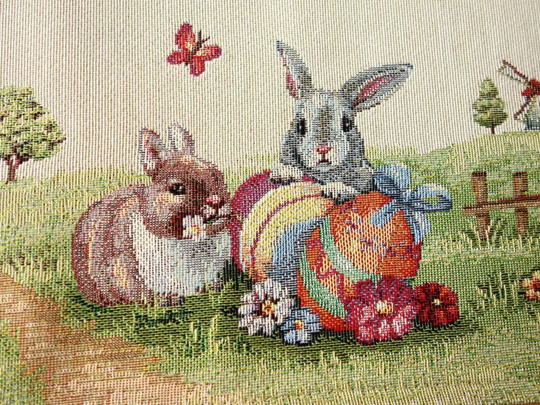 Wielkanocny dekoracyjny obrus gobelinowy w rozmiarze 100x100 cm, został wykonany z tkaniny hiszpańskiej 25% bawełna, 70 % poliester, 5% poliakryl - tkanina tkana żakardowa ze wzorem wielkanocnym idealnie podkreślającym magiczny klimat świąteczny.Niepowtarzalne wzornictwo serwety gobelinowej z kurczaczkami, kolorowymi pisankami podkreśli wystrój każdego wnętrza na czas wielkanocny. Jest to niezastąpiony element do salonu, kuchni, który może odmienić każde wnętrze oraz magicznie podkreślić jego wystrój. Wzornictwo nawiązuje do tradycyjnych gobelinów które dawniej zdobiły ściany w domach. Zastosowana tkanina jest tkana, gruba, nie gniecie. Różnorodność wzorów na poszewkach gobelinowych zadowoli każdego kto pragnie aby w jego pomieszczeniu zagościł niepowtarzalny magiczny sielski klimat.
