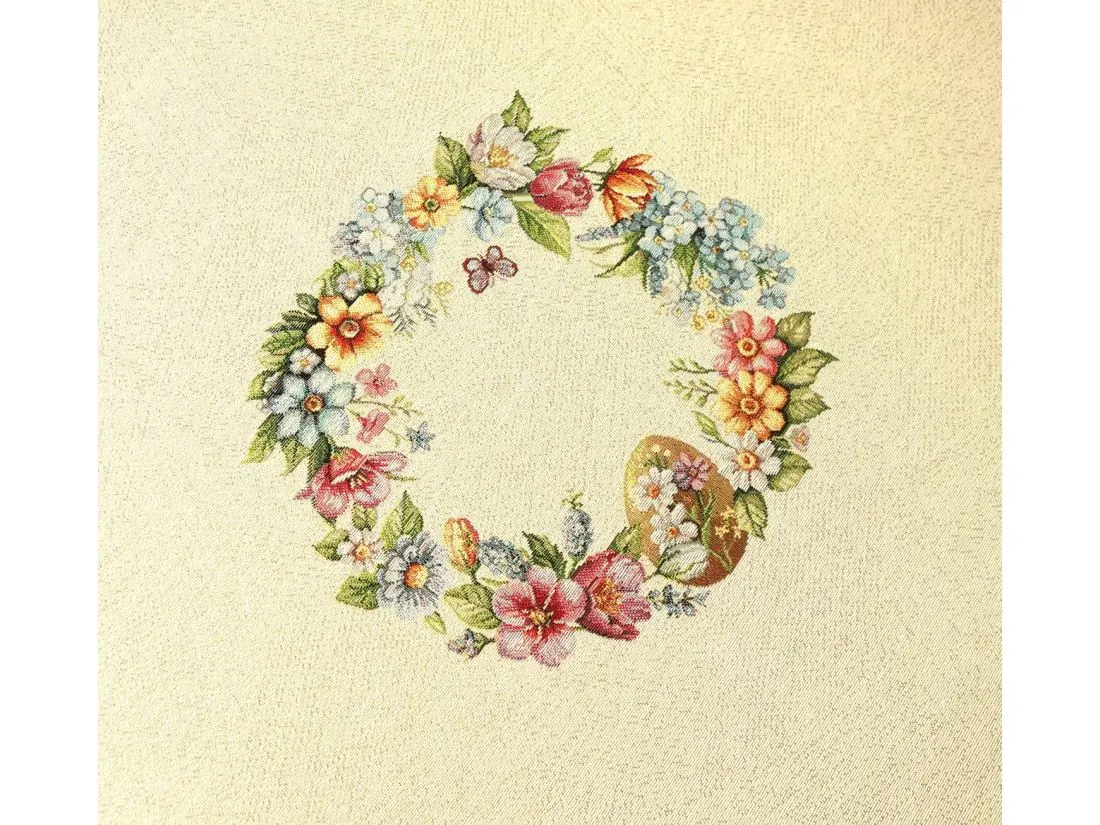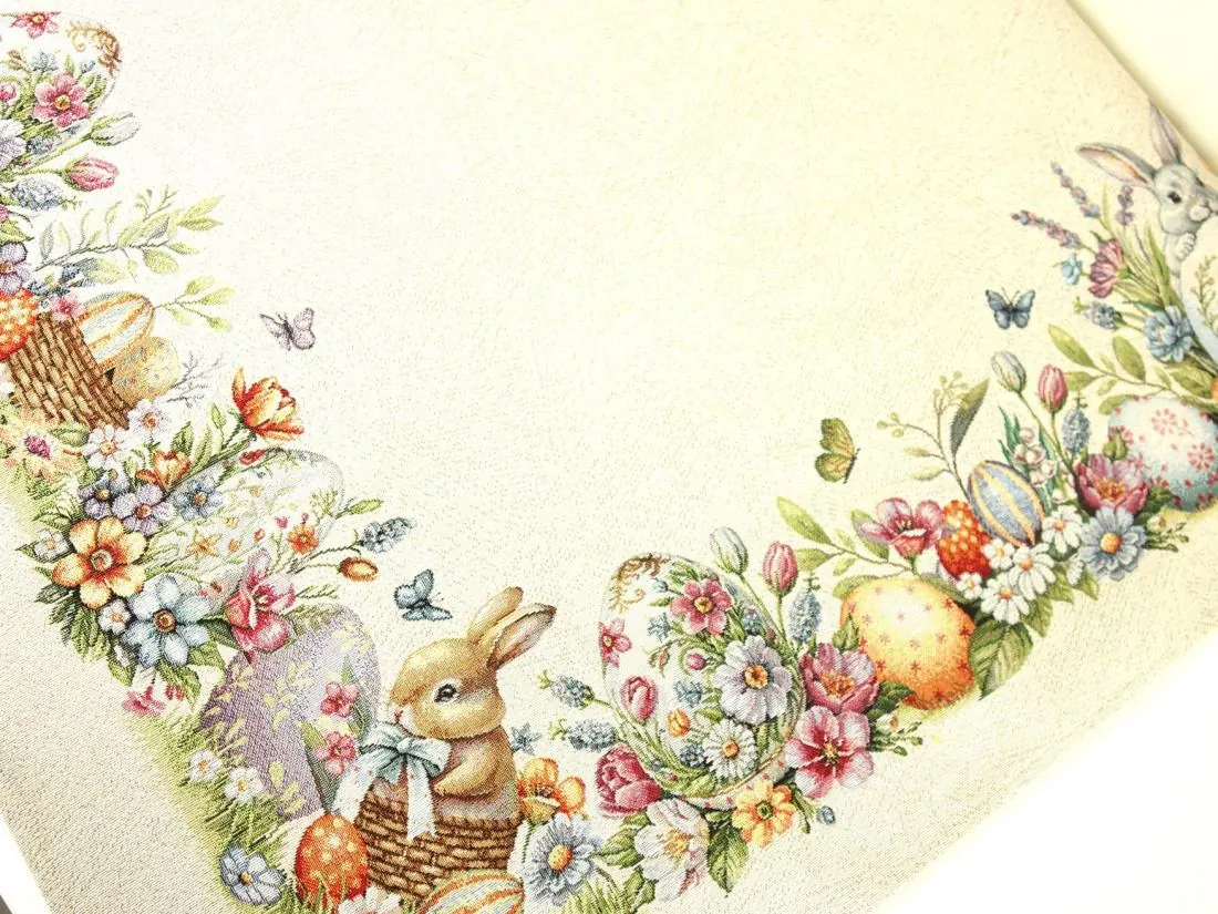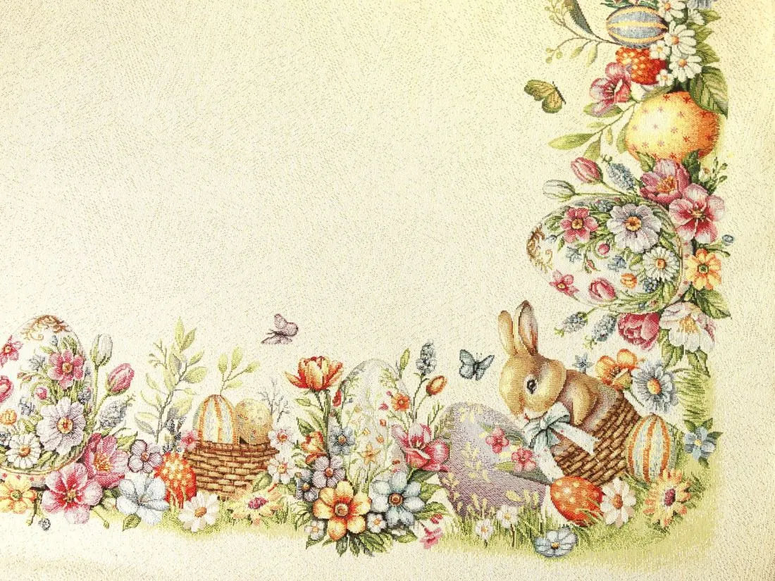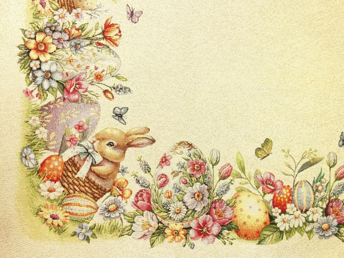 Wielkanocny dekoracyjny obrus gobelinowy w rozmiarze 140x180 cm, został wykonany z tkaninyhiszpańskiej 25% bawełna, 70 % poliester, 5% poliakryl- tkanina tkana żakardowa ze wzorem wielkanocnym idealnie podkreślającym magiczny klimat świąteczny.