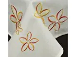 Obrus wyróżnia się starannie wykonanym haftem kwiatowym w ciepłych odcieniach żółci i pomarańczu. Subtelne kompozycje roślinne ożywiają aranżację stołu i wprowadzają do wnętrza pogodny, wiosenno-letni klimat.