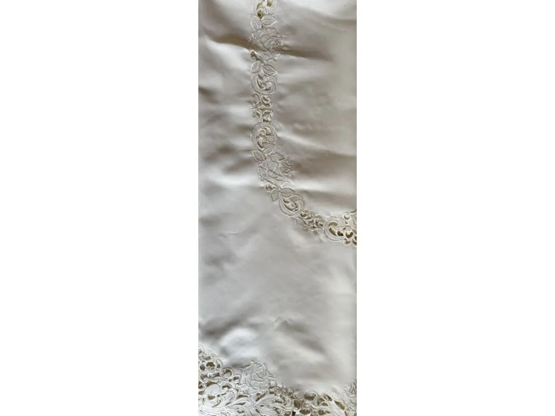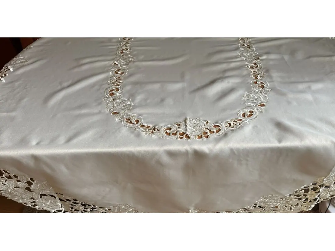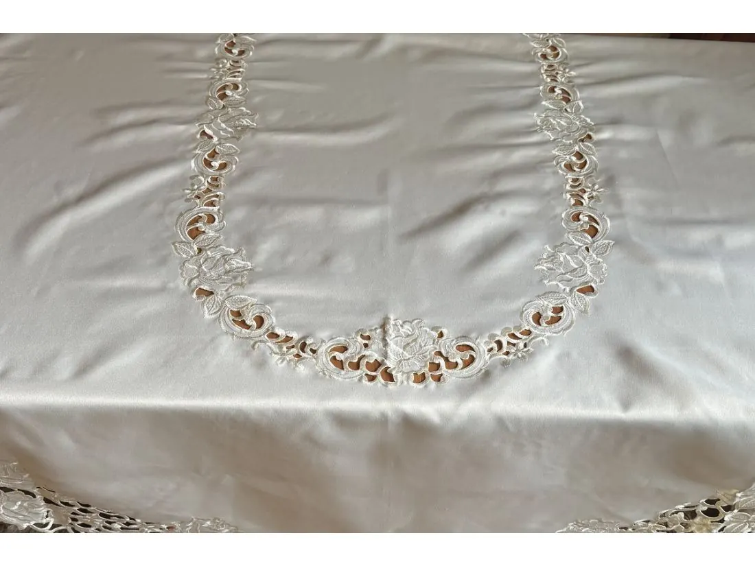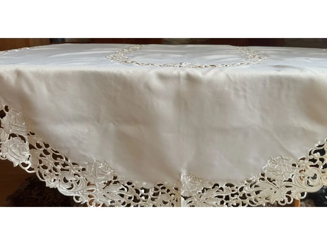 Obrus haftowany to wyjątkowy dodatek na każdy stół, nadając mu niepowtarzalnego uroku. Wykonany w 100% z poliestru, łączy w sobie wytrzymałość i delikatność, tworząc efektowną ozdobę, która może przekształcić każdą okazję w wyjątkową chwilę.