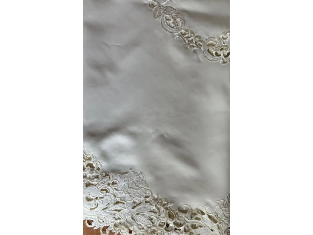 Obrus haftowany to wyjątkowy dodatek na każdy stół, nadając mu niepowtarzalnego uroku. Wykonany w 100% z poliestru, łączy w sobie wytrzymałość i delikatność, tworząc efektowną ozdobę, która może przekształcić każdą okazję w wyjątkową chwilę.