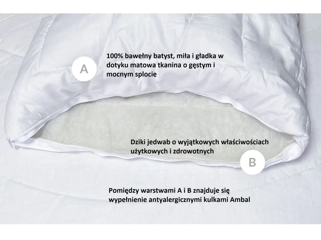 Poduszka Imperial Dziki jedwab polskiego producenta AMW wykonana jest z najwyższej jakości surowców. Poszewka poduszki wykonana jest od zewnętrznej strony z tkaniny batyst 100 % bawełna która jest miła i gładka w dotyku. Tkanina jest matowa o gęstym i mocnym splocie. Od wewnętrznej strony poszewka podszyta jest 100 % dzikim jedwabiem o wyjątkowych właściwościach użytkowych i zdrowotnych. Jedwab należy do materiałów przyjaznych osobom z alergiami. Nie elektryzuje się, nie przyciąga grzybów, ani roztoczy. Jedną z cech jedwabiu jest nieustanna wymiana powietrza, co niesamowicie poprawia komfort snu.