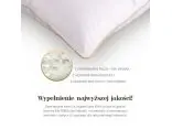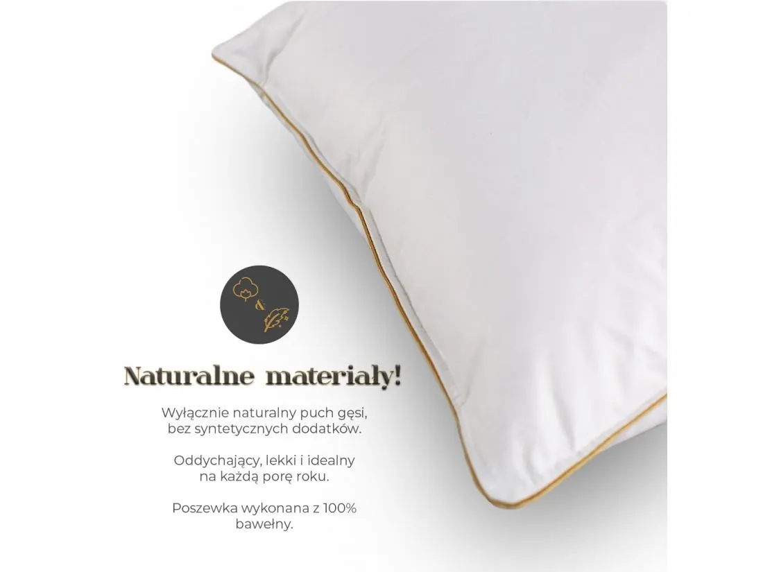 Wypełnienie poduszki to wyłącznie naturalny puch gęsi bez żadnych syntetycznych dodatków. Dzięki podwójnemu procesowi prania puch jest wyjątkowo czysty, świeży i bezpieczny dla alergików. Produkt jest w całości wyprodukowany w Polsce i posiada certyfikaty potwierdzające jego jakość oraz bezpieczeństwo.