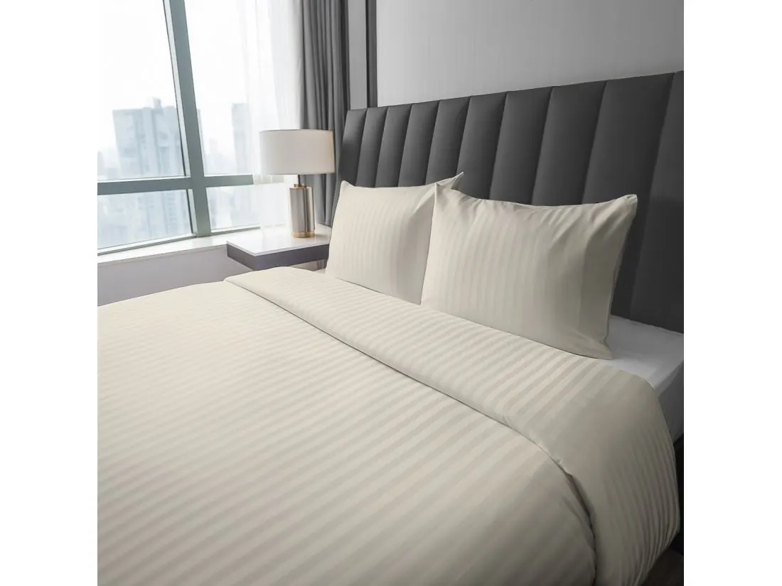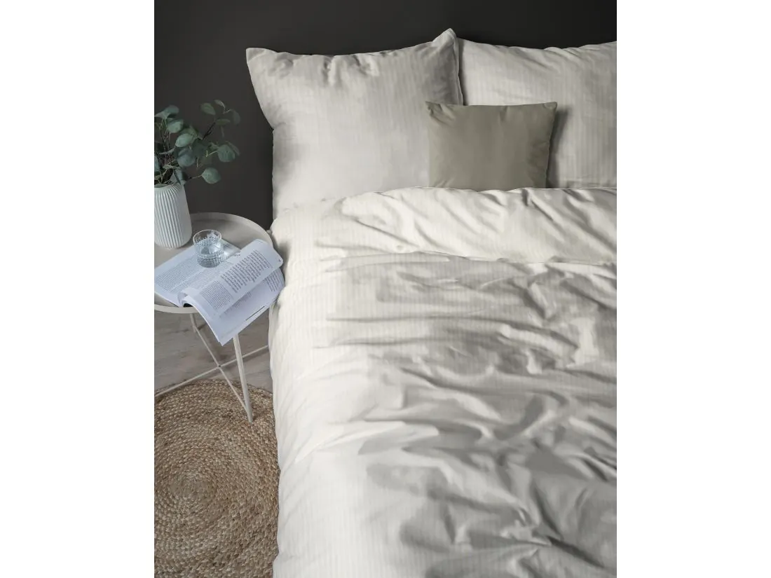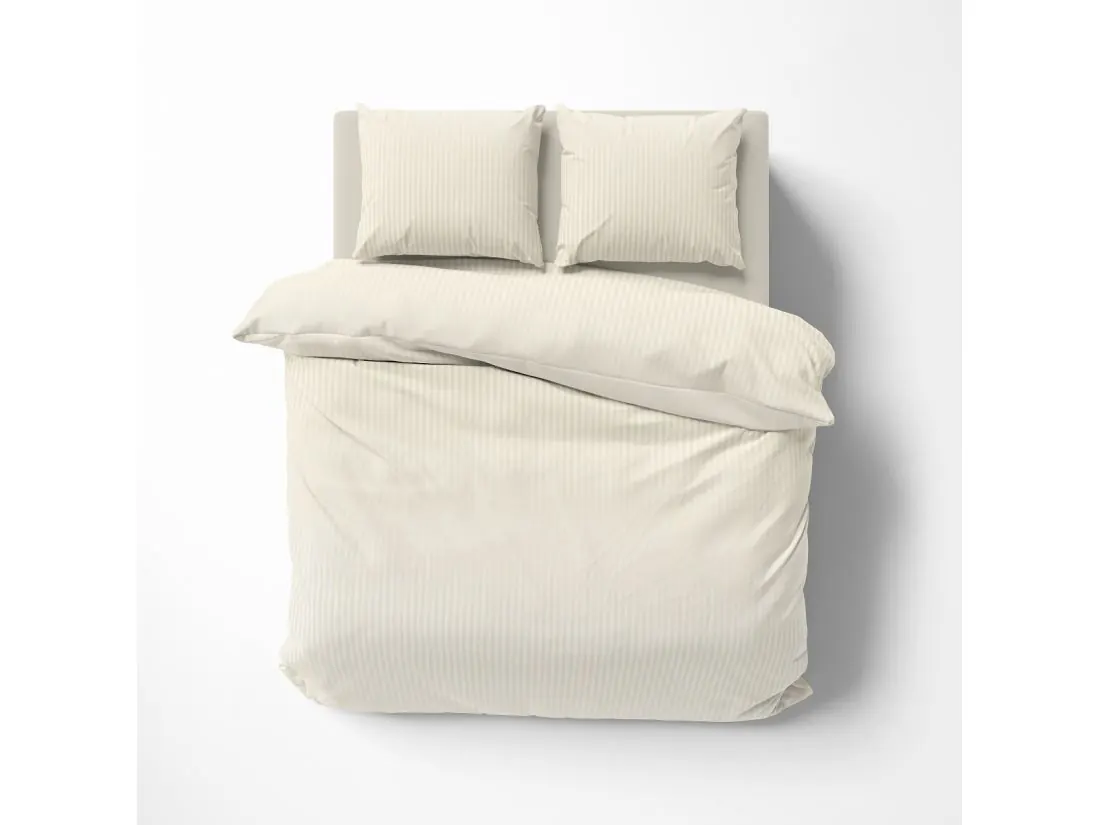 Pościel posiada delikatny, pionowy, prążkowany wzór. Zarówno tło, jak i paseczki o szerokości 1 cm utrzymane są w bardzo zbliżonej tonacji ecru, dzięki czemu całość wygląda niezwykle subtelnie. Cienkie, regularne prążki tworzą efekt satynowego połysku, który dodaje strukturze tkaniny głębi.