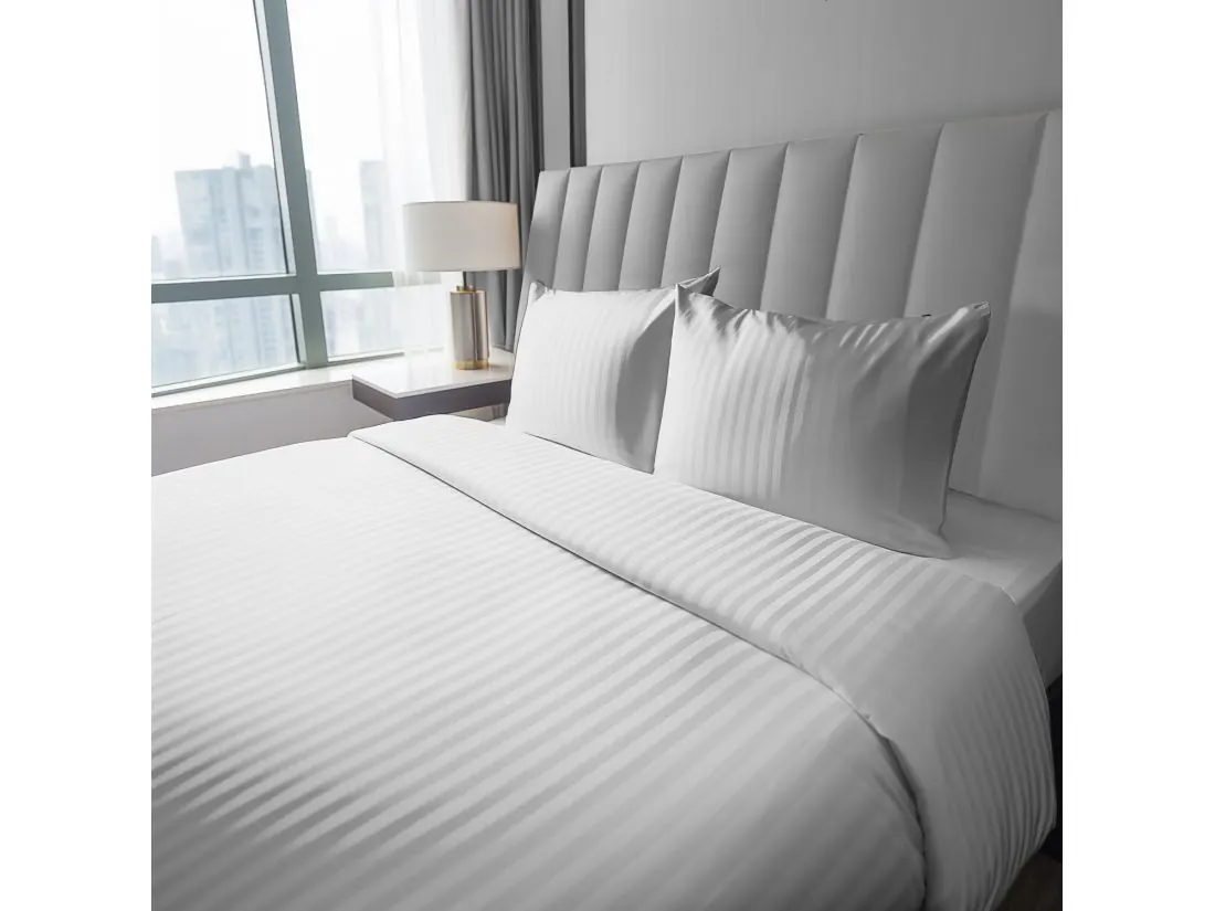 Elegancki design – biały kolor i subtelny pasek tworzą ponadczasowy, szykowny zestaw pasujący do każdej sypialni.