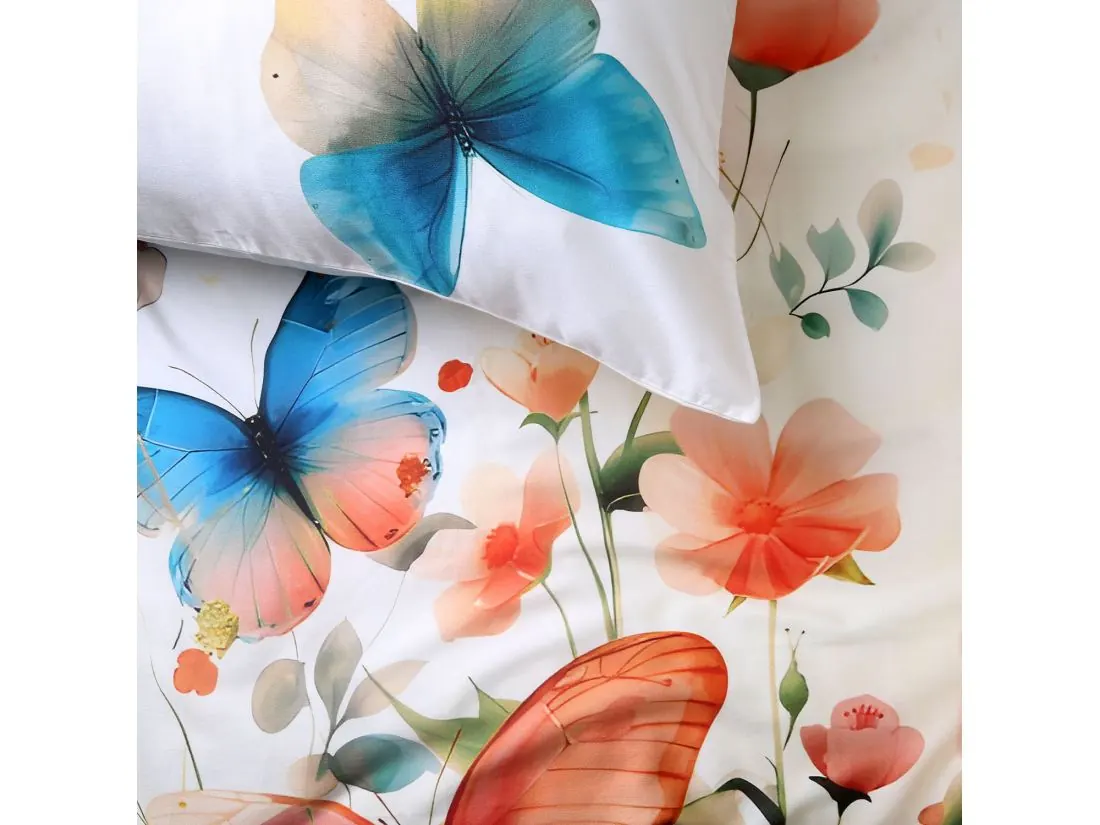 Przedstawiamy komplet pościeli z ekskluzywnej kolekcji SATYNLOVE PREMIUM. Wzór na tkaninie to artystyczny print z motylami i kwiatami, wykonany z akwarelową precyzją. Motyw łączy duże niebieskie motyle z delikatnymi kwiatami, takimi jak maki i stokrotki, w ciepłych odcieniach koralowego różu i pomarańczy. Rozproszony układ roślinności z zielonymi liśćmi na białym tle tworzy wrażenie wiosennej łąki i wyjątkowej przestrzenności.