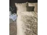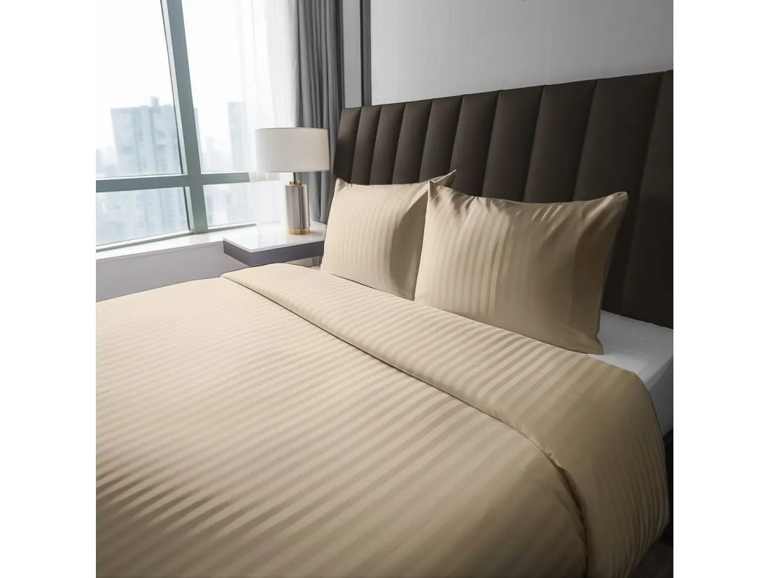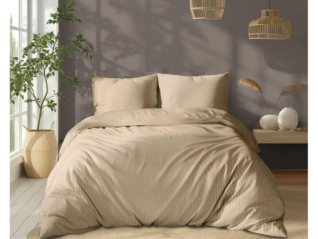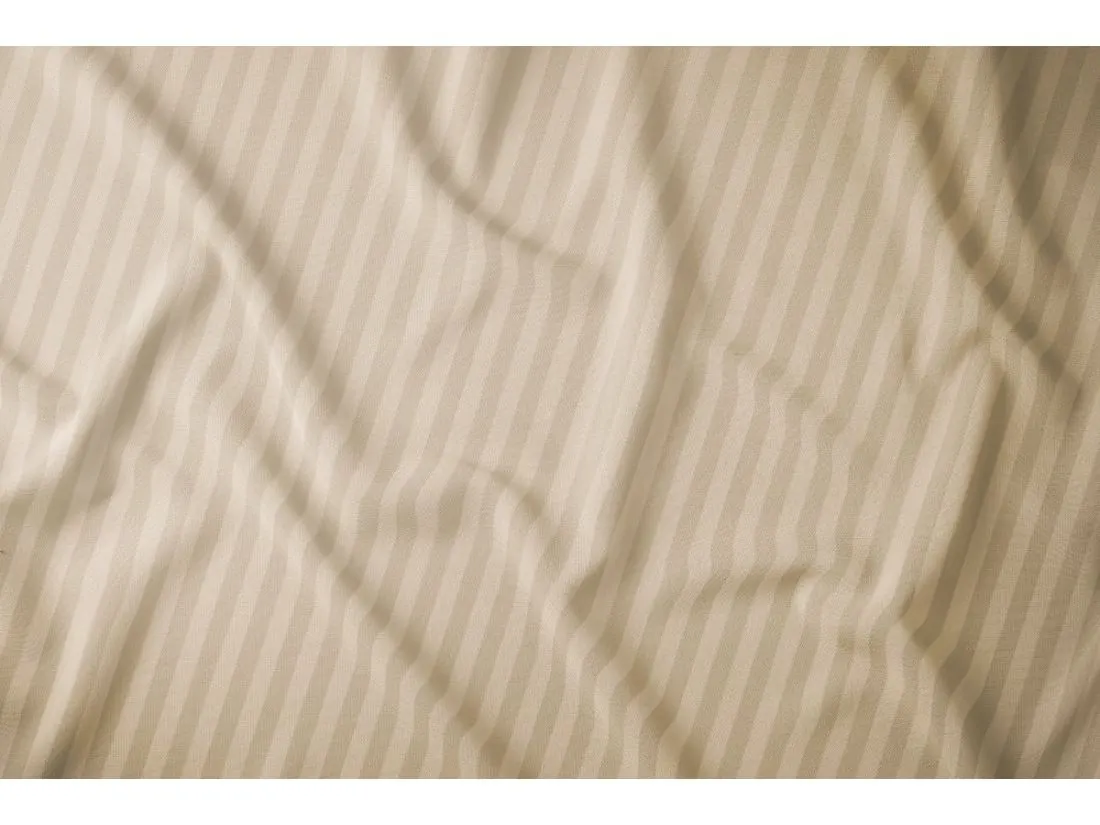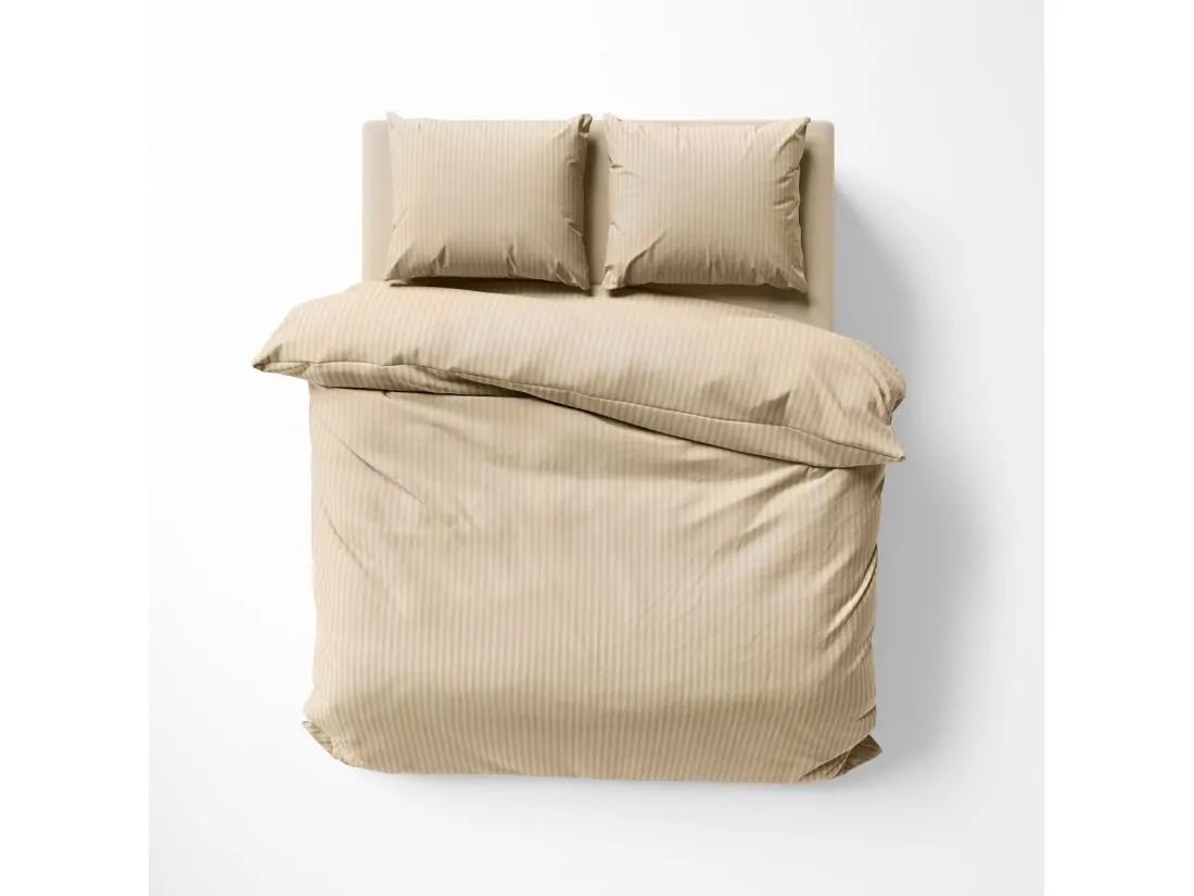 Pościel posiada klasyczny, pionowy, prążkowany wzór o szerokości 1 cm. Piaskowy beż to odcień niezwykle szlachetny – cieplejszy niż ecru, ale równie uniwersalny. Satynowy splot adamaszku sprawia, że paski mienią się w świetle, nadając tkaninie wielowymiarowości i przytulnego, "słonecznego" charakteru.
