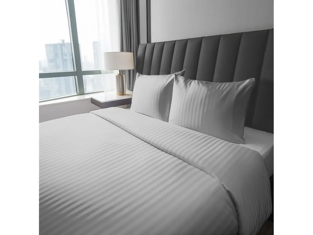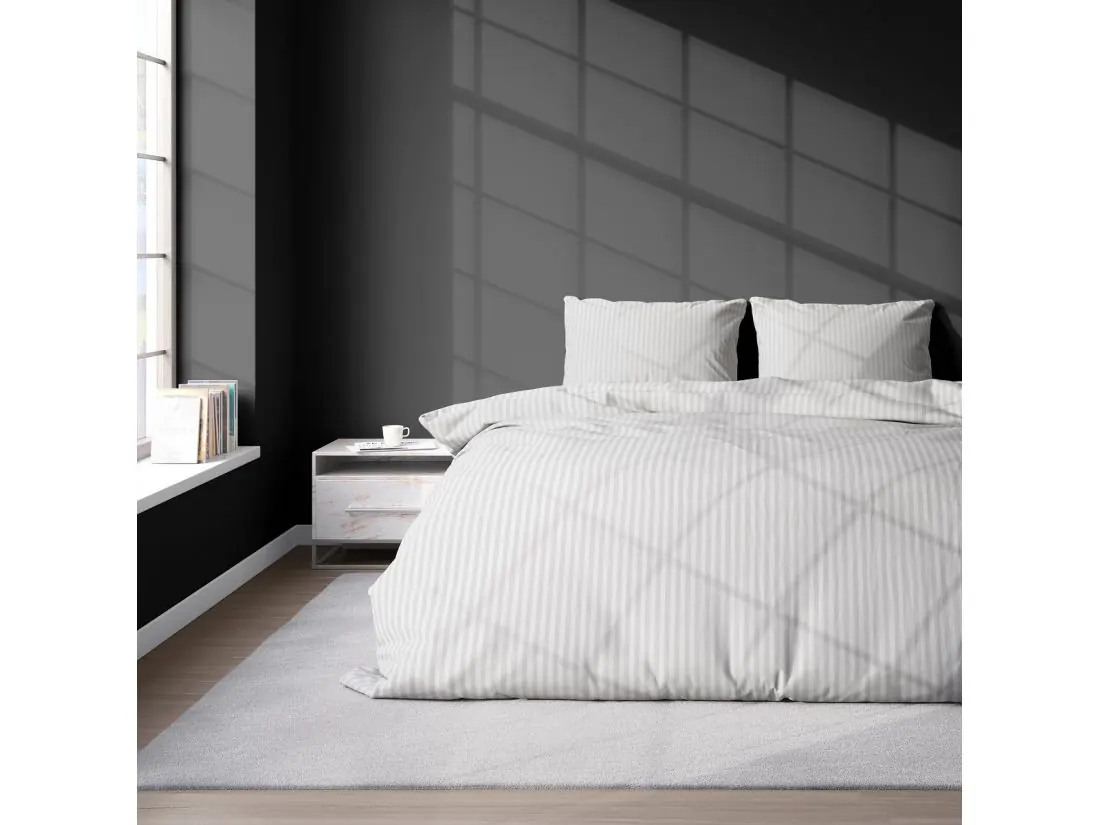 Pościel posiada klasyczny, pionowy wzór prążkowany o szerokości 1 cm. Srebrzysty odcień w połączeniu ze splotem satynowym tworzy efekt "płynnego metalu", który pięknie pracuje ze światłem w sypialni. Paski nadają całości uporządkowany, geometryczny rytm, który optycznie wydłuża i porządkuje przestrzeń łóżka.