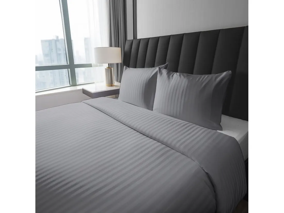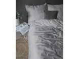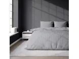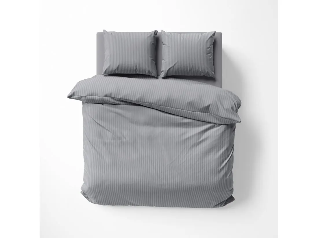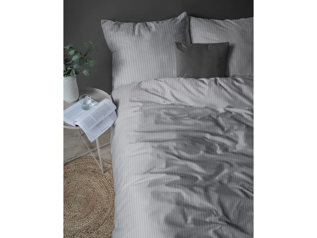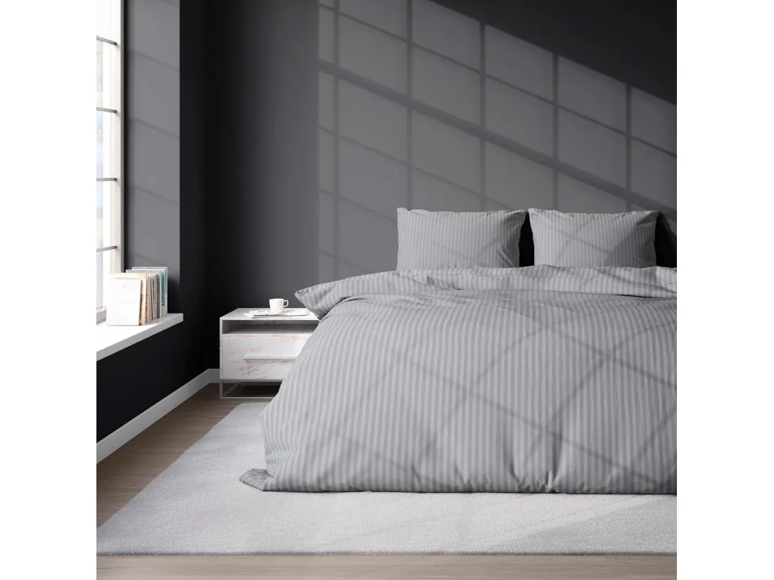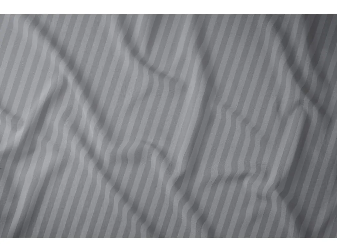 Pościel posiada ponadczasowy, pionowy, prążkowany wzór. Zarówno tło, jak i paseczki o szerokości 1 cm utrzymane są w eleganckiej szarości, co tworzy harmonijną i wyciszającą całość. Cienkie, regularne prążki w tym kolorze szczególnie efektownie odbijają światło, tworząc luksusowy efekt satynowej tafli.