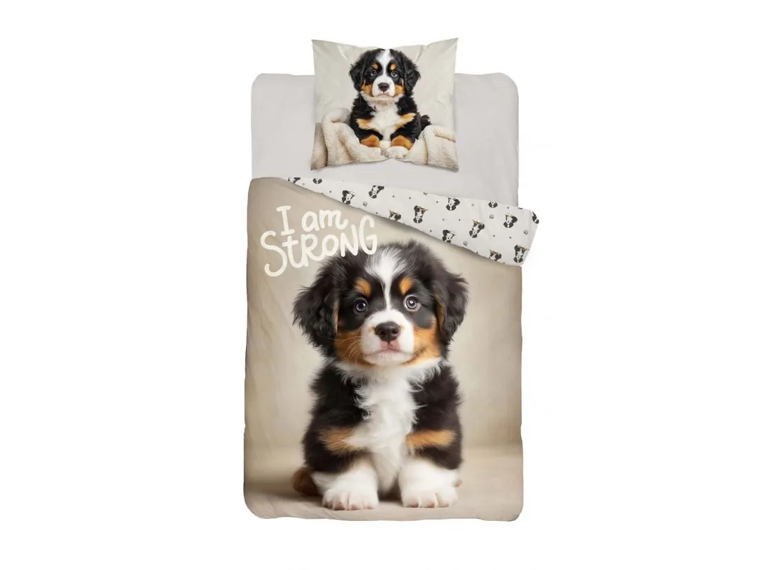 Centralnym elementem kołdry jest realistyczny portret uroczego szczeniaka rasy berneński pies pasterski – czarno-biała sierść z brązowymi akcentami, jasne futro na łapkach i pyszczku, niewinne spojrzenie. Nad głową szczeniaka widoczny jest motywujący napis „I am strong”.