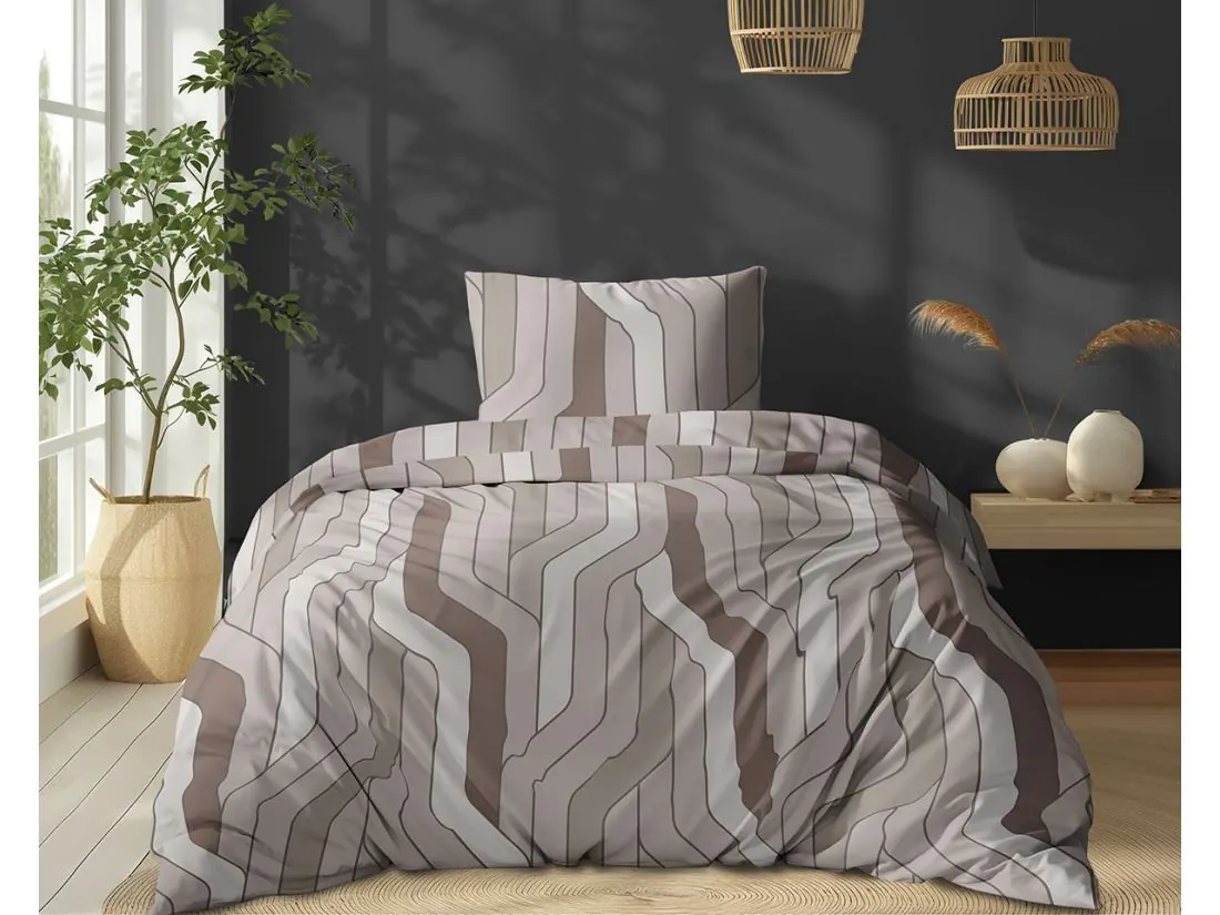 Wzór na tej pościeli to nowoczesna kompozycja geometrycznych linii, które tworzą efekt głębi i dynamiki. Stonowana paleta barw (beże, taupe, brązy) sprawia, że zestaw idealnie wpisuje się w aktualne trendy wnętrzarskie. To pościel bawełna 100% oddychająca, która wprowadzi do Twojej sypialni spokój i uporządkowany charakter.
