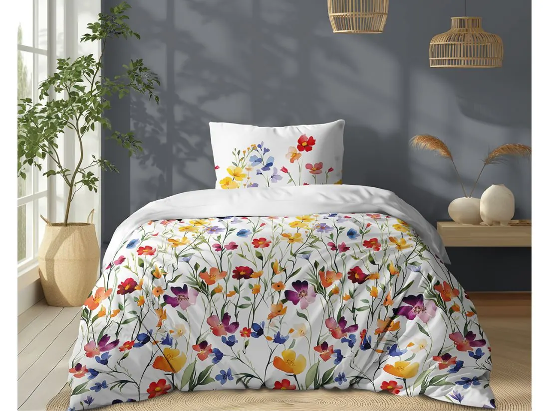 Gęsta, wielobarwna łączka utrzymana w stylu radosnej akwareli nadaje pościeli świeżości i nowoczesnego sznytu, zamieniając łóżko w barwną oazę letniego wypoczynku.