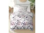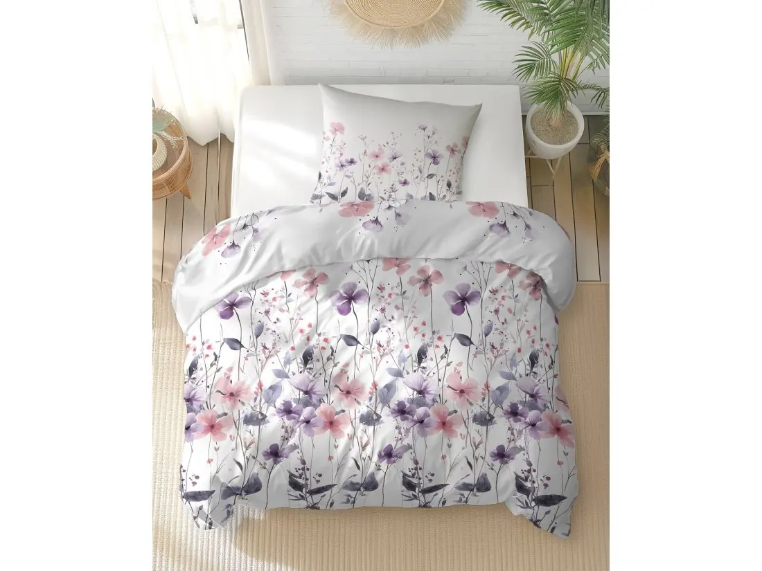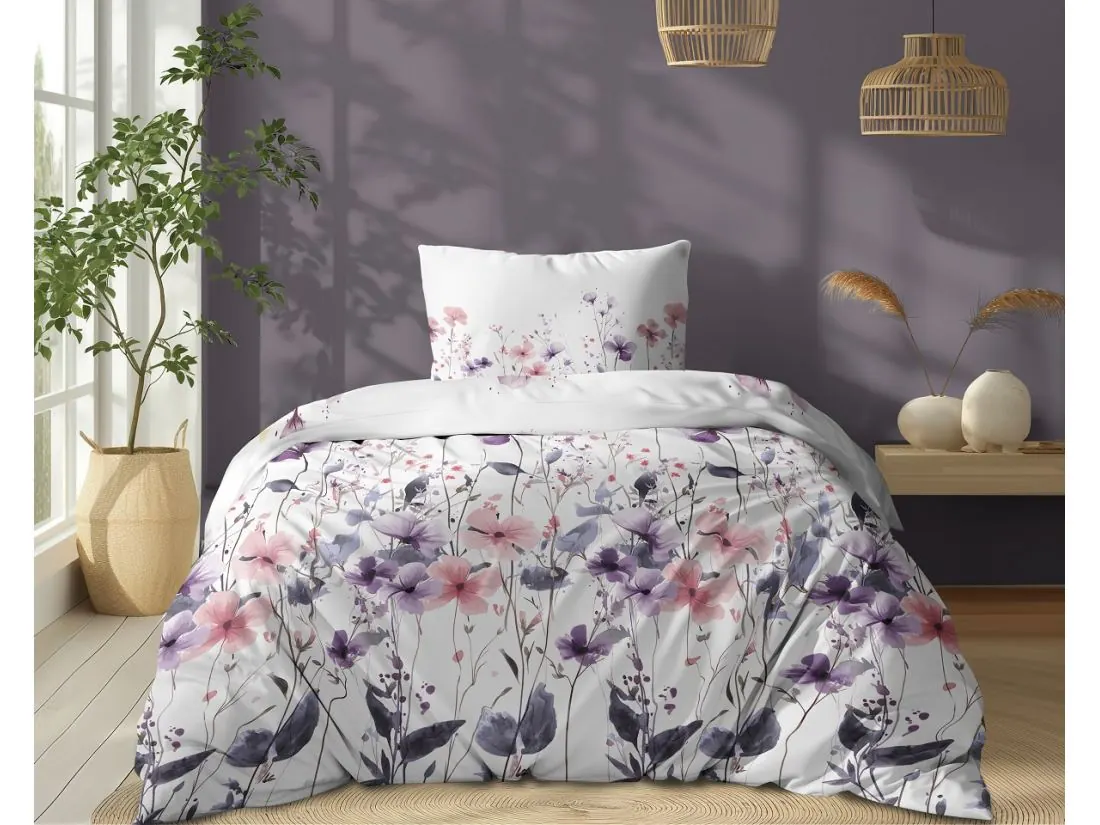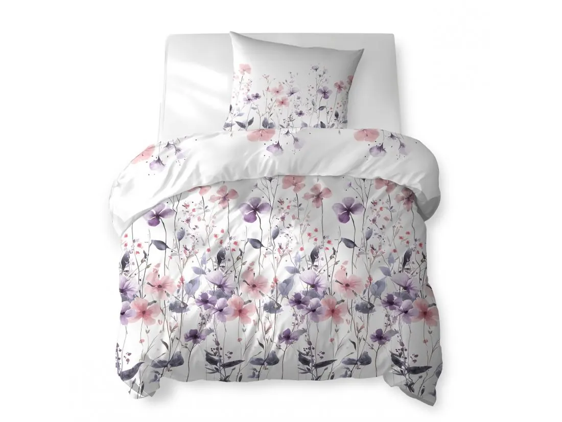 Wzór tej pościeli bawełnianej przedstawia subtelną, akwarelową łąkę pełną delikatnych kwiatów w odcieniach fioletu, lawendy, liliowego i pudrowego różu. Motyw zbudowany jest z cienkich, smukłych łodyg oraz drobnych i większych kwiatów, niemal uniesionych lekką, rozmytą akwarelą na białym tle. Wśród kompozycji dominuje wyważone rozmieszczenie liści i pąków w stonowanych szarościach i błękitach, co nadaje wzorowi eleganckiego, lekko romantycznego charakteru.