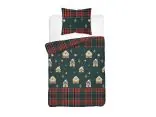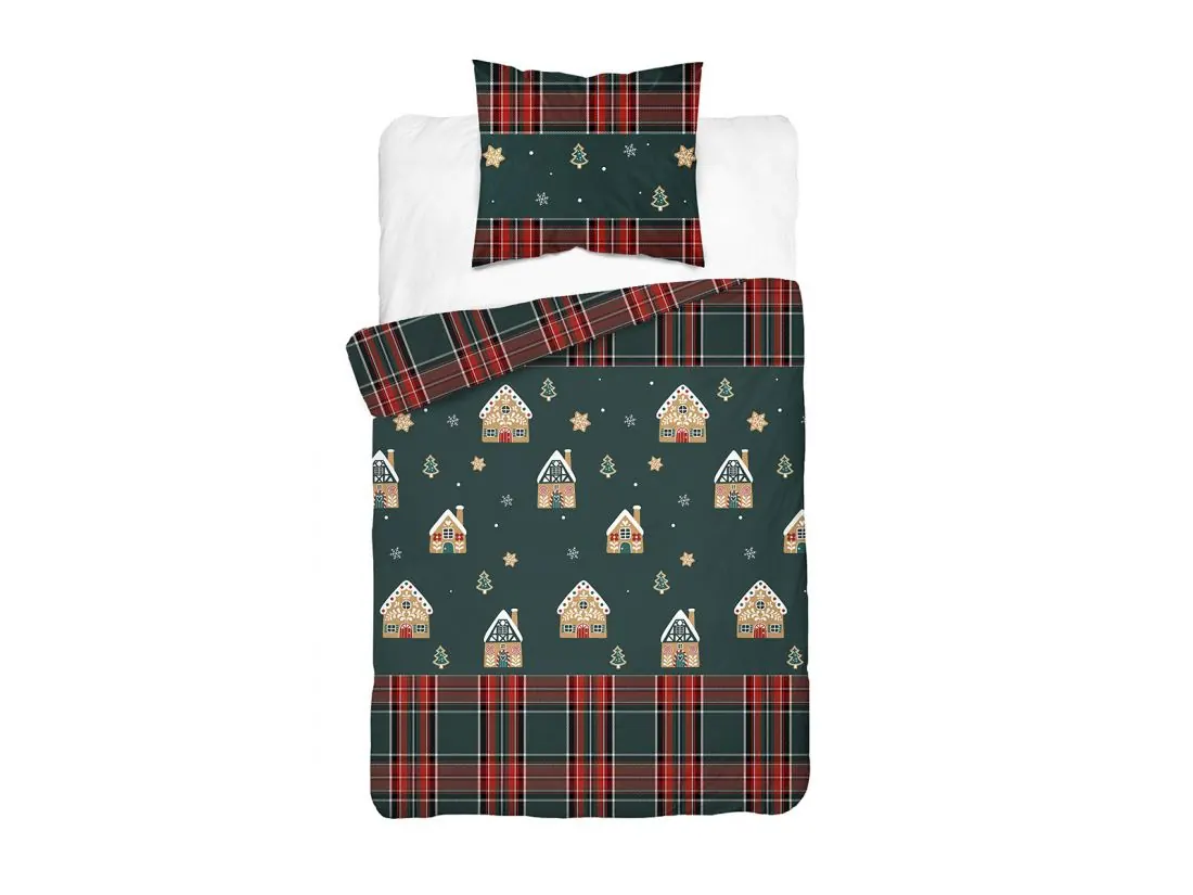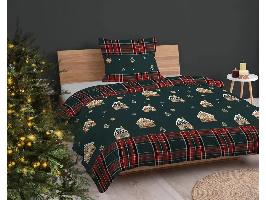 Wzór tej pościeli świątecznej przywołuje klimat zimowego, rodzinnego czasu i świąt Bożego Narodzenia. Dominującym motywem są urocze domki z piernika, małe choinki, śnieżynki i gwiazdki przypominające korzenne ciasteczka, rozmieszczone na głębokim, butelkowozielonym tle.