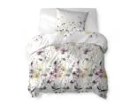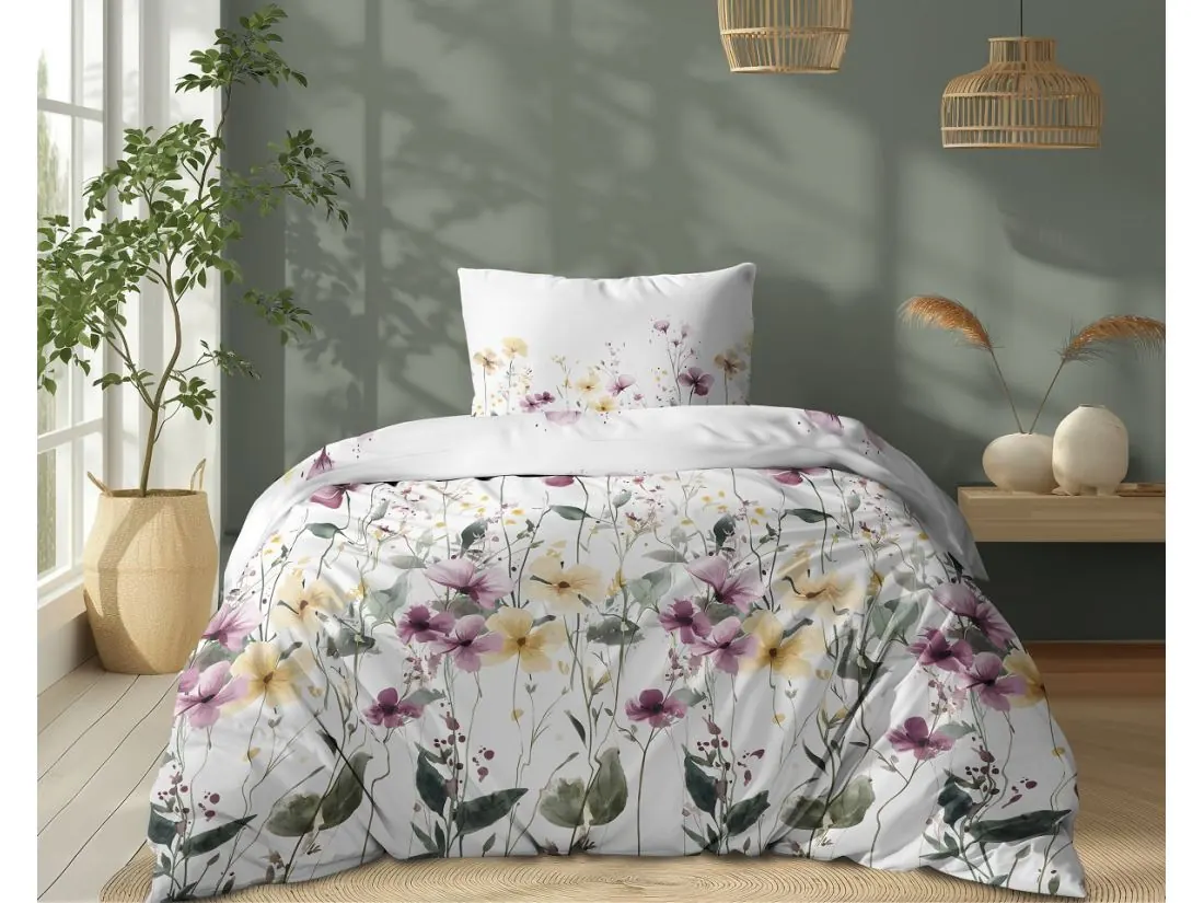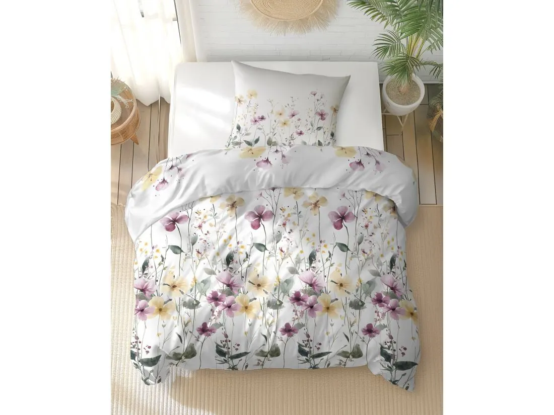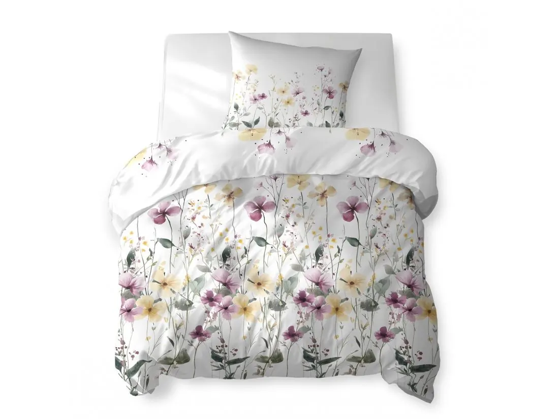Ten wzór pościeli bawełnianej to delikatna, akwarelowa łąka pełna kwiatów w pastelowych odcieniach żółci, różu, fioletu i beżu. Wzór tworzony jest przez cienkie, subtelne łodygi, różnej wielkości płatki i drobne kwiatki tła, co daje niezwykle naturalny, lekki efekt. Kwiaty mają akcenty w subtelnych żółciach i pudrowych różach, a szare i zielone liście łagodnie przeplatają się w tle, tworząc harmonijną kompozycję.