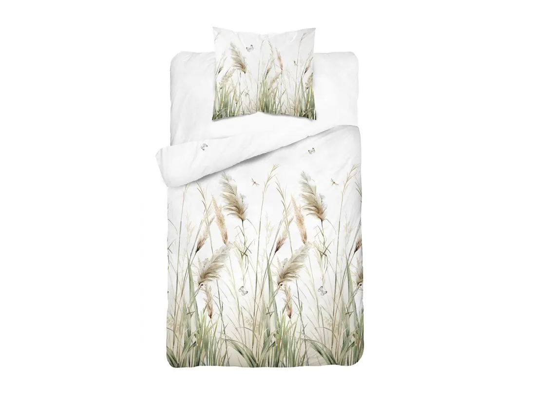 Wzór przedstawia wysokie trawy i puszyste pióropusze traw pampasowych, które pną się ku górze od dolnej krawędzi kołdry. Między źdźbłami ukryte są subtelne detale – drobne motyle i ważki, które dodają kompozycji życia i sielskiego charakteru. Dominująca w górnej części biel potęguje wrażenie czystości i przestrzeni, idealnie eksponując roślinny motyw.