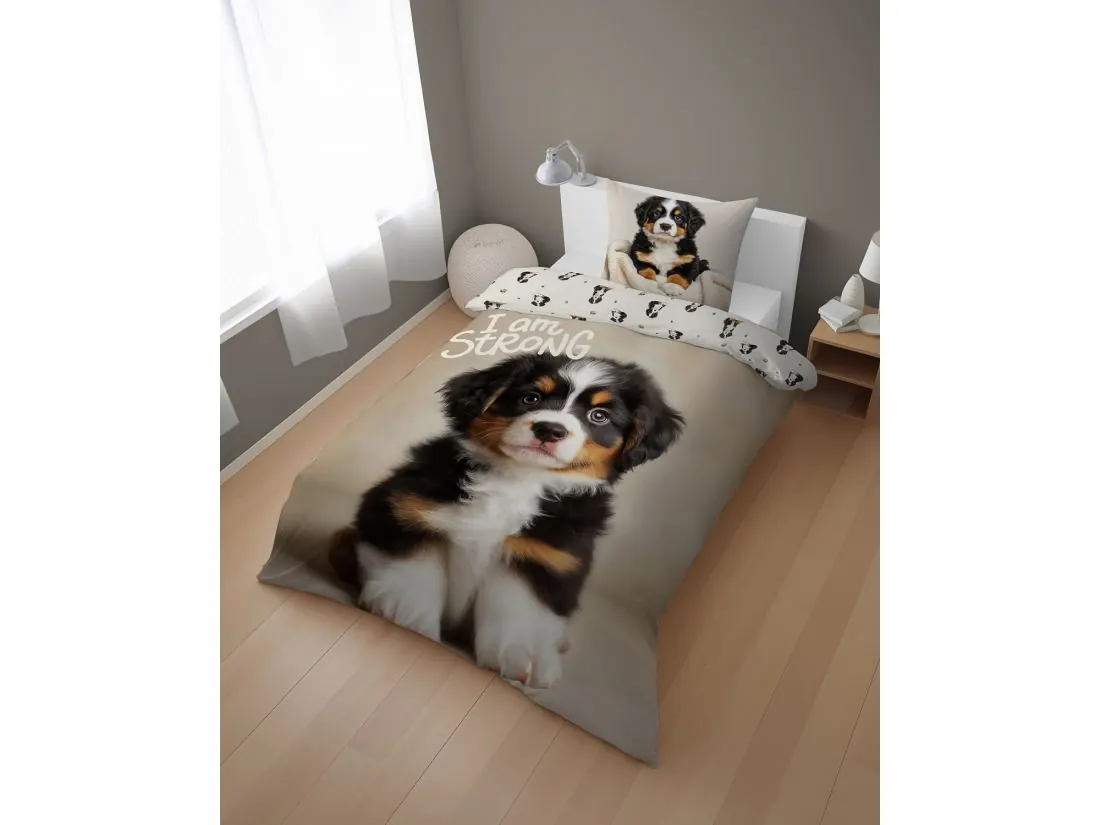 Centralnym elementem kołdry jest realistyczny portret uroczego szczeniaka rasy berneński pies pasterski – czarno-biała sierść z brązowymi akcentami, jasne futro na łapkach i pyszczku, niewinne spojrzenie. Nad głową szczeniaka widoczny jest motywujący napis „I am strong”.