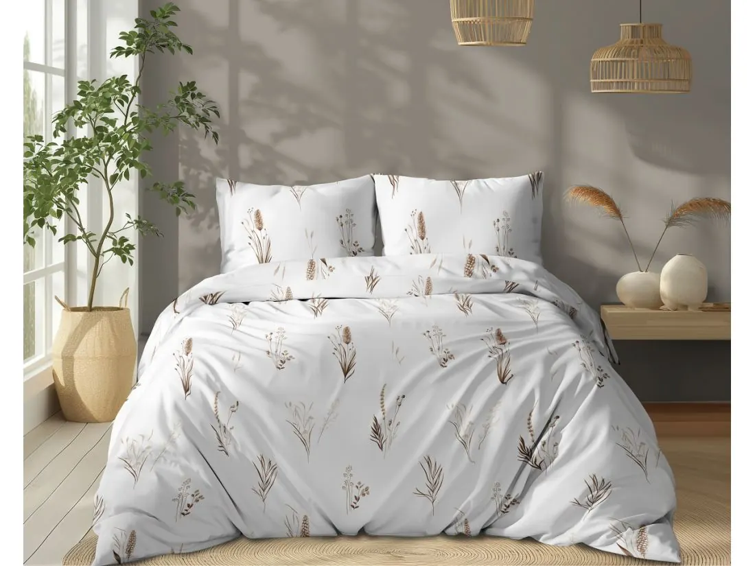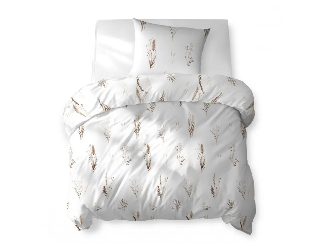 Wzór tej pościeli bawełnianej cechuje minimalistyczna elegancja inspirowana naturą. Na czystym, białym tle rozmieszczono delikatne, rysunkowe motywy traw i polnych roślin w stonowanych, beżowych i brązowych odcieniach. Każdy z kłosów, liści i łodyg został oddany z dbałością o subtelny detal, dzięki czemu wzór przypomina lekki szkic akwarelowy.