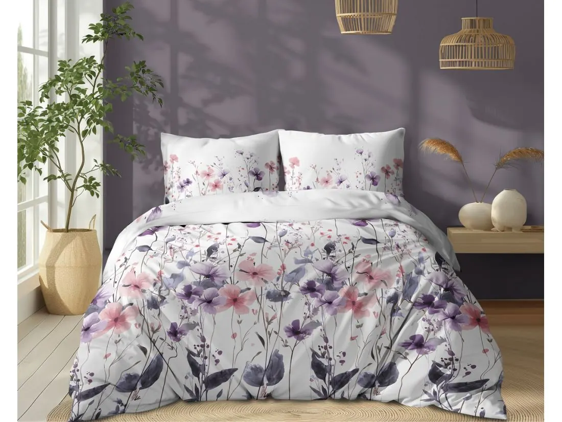 Wzór tej pościeli bawełnianej przedstawia subtelną, akwarelową łąkę pełną delikatnych kwiatów w odcieniach fioletu, lawendy, liliowego i pudrowego różu. Motyw zbudowany jest z cienkich, smukłych łodyg oraz drobnych i większych kwiatów, niemal uniesionych lekką, rozmytą akwarelą na białym tle. Wśród kompozycji dominuje wyważone rozmieszczenie liści i pąków w stonowanych szarościach i błękitach, co nadaje wzorowi eleganckiego, lekko romantycznego charakteru.