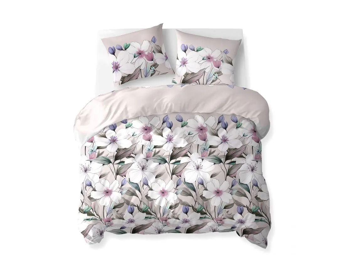Wzór tej pościeli bawełnianej prezentuje rozległą, stylizowaną łąkę pokrytą dużymi, białymi kwiatami o delikatnych, subtelnie fioletowych i różowych środku. Kwiaty otoczone są ulistnieniem w różnych odcieniach zieleni, szarości oraz beżu, a także pąkami utrzymanymi w tonacjach fioletu, różu i niebieskiego. Całość osadzona jest na stonowanym, jasnobeżowym tle, które znakomicie podkreśla elegancję wzoru i nadaje kompozycji harmonijny, spokojny charakter.