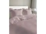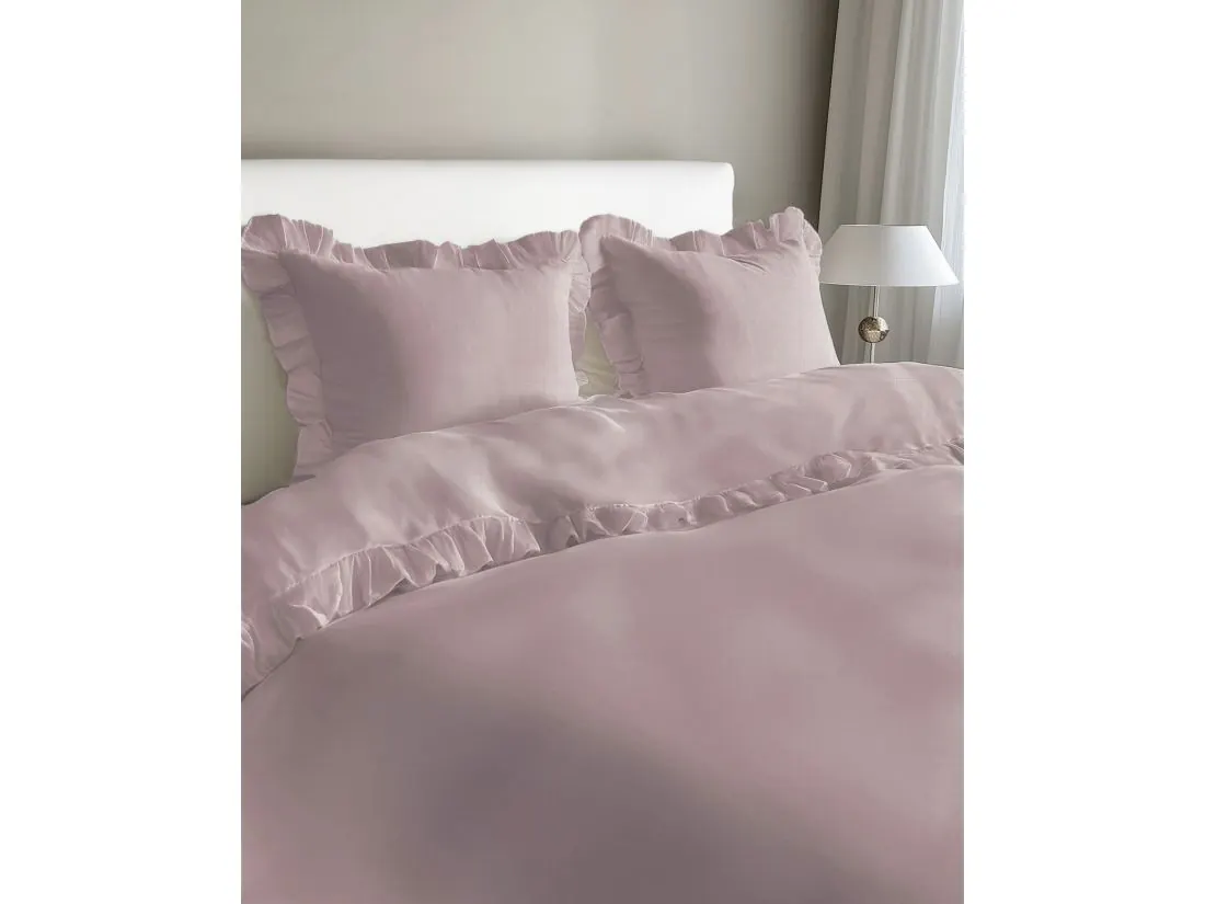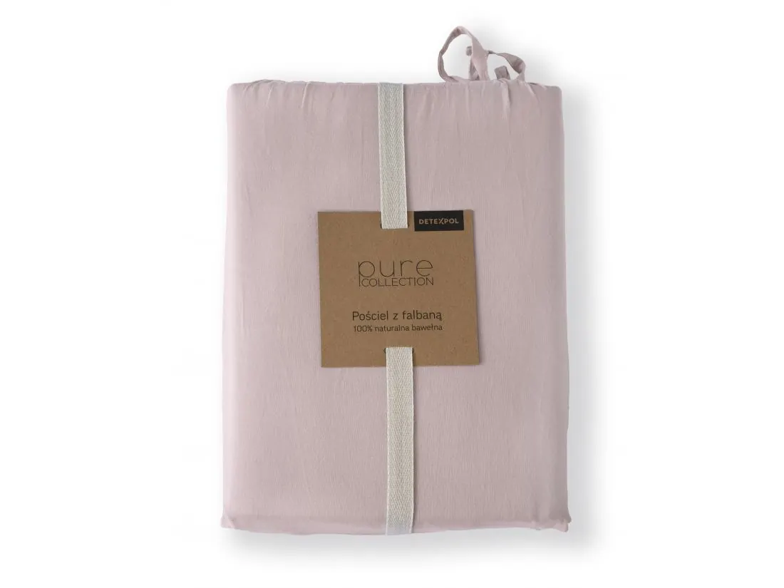 Dekoracyjne falbanki z czterech stron poszwy oraz na brzegach poszewki nadają zestawowi romantyczny, subtelny wygląd. Zapięcie na eleganckie guziki podkreśla naturalny i ponadczasowy charakter kompletu. Całość zapakowana jest w ekologiczny worek z tej samej tkaniny i w identycznym kolorze pudrowego różu, który świetnie sprawdzi się jako organizer lub worek na bieliznę.