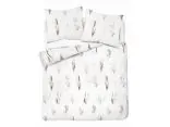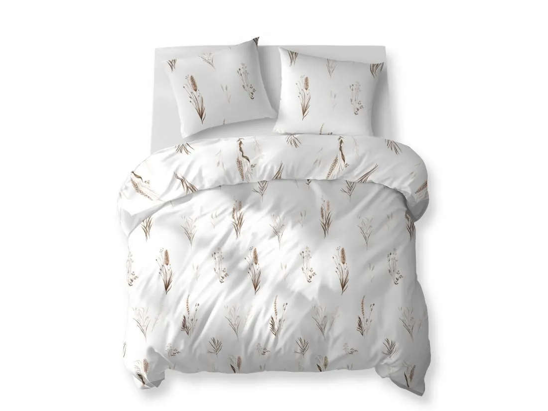 Wzór tej pościeli bawełnianej cechuje minimalistyczna elegancja inspirowana naturą. Na czystym, białym tle rozmieszczono delikatne, rysunkowe motywy traw i polnych roślin w stonowanych, beżowych i brązowych odcieniach. Każdy z kłosów, liści i łodyg został oddany z dbałością o subtelny detal, dzięki czemu wzór przypomina lekki szkic akwarelowy.
