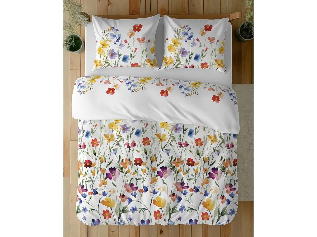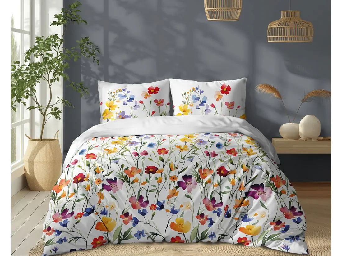 Gęsta, wielobarwna łączka utrzymana w stylu radosnej akwareli nadaje pościeli świeżości i nowoczesnego sznytu, zamieniając łóżko w barwną oazę letniego wypoczynku.
