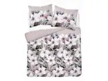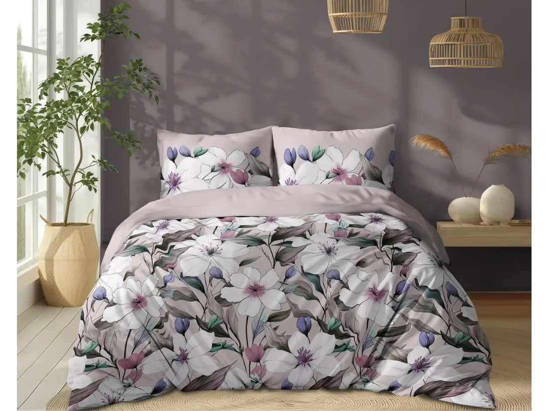 Wzór tej pościeli bawełnianej prezentuje rozległą, stylizowaną łąkę pokrytą dużymi, białymi kwiatami o delikatnych, subtelnie fioletowych i różowych środku. Kwiaty otoczone są ulistnieniem w różnych odcieniach zieleni, szarości oraz beżu, a także pąkami utrzymanymi w tonacjach fioletu, różu i niebieskiego. Całość osadzona jest na stonowanym, jasnobeżowym tle, które znakomicie podkreśla elegancję wzoru i nadaje kompozycji harmonijny, spokojny charakter.