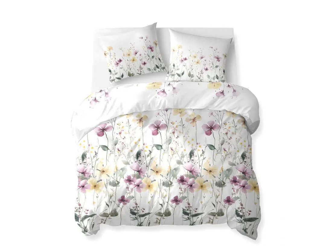 Pościel bawełniana z motywem łąki w kwiaty żółte i różowe na jasnym białym tle to doskonałe połączenie naturalnej elegancji, jakości i komfortu użytkowania. Doskonale wprowadzi radość, świeżość i przytulny klimat do Twojej sypialni — idealna zarówno na prezent, jak i do codziennego użytku w domu.