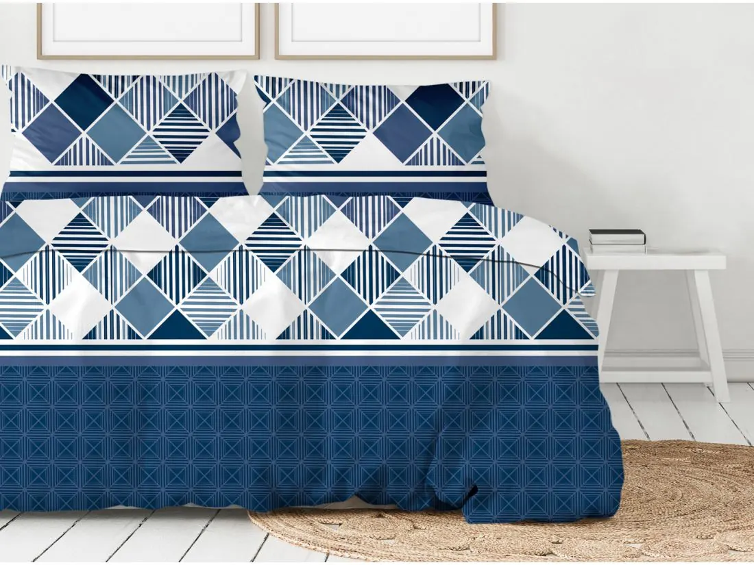 Komplet pościeli z bawełny wzór Loft w rozmiarze 220 x 200 cm + 2 poszewki 70 x 80 cm to najnowsze trendy w konfekcji pościelowej oraz nowatorski wzór geometryczny w modnej granatowo białej kolorystyce.