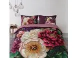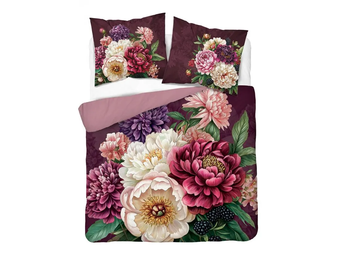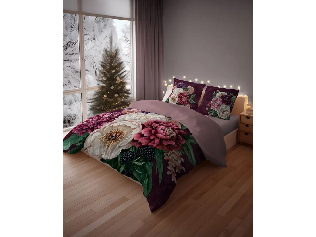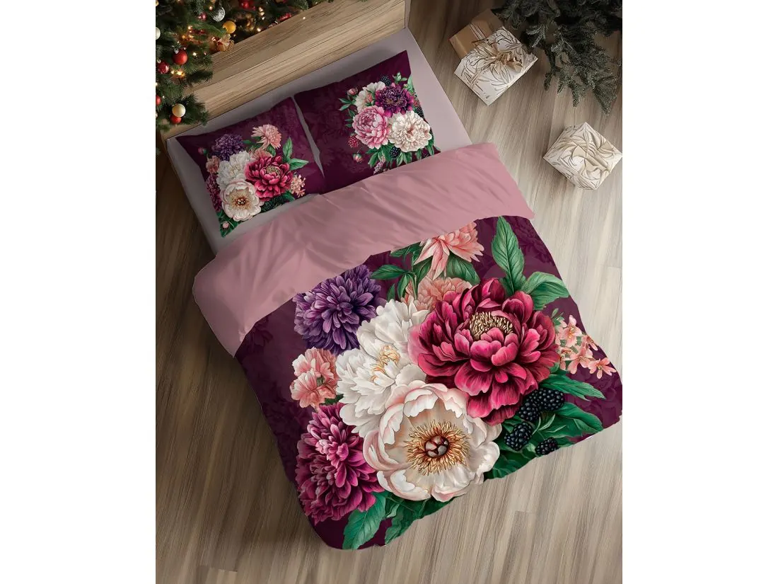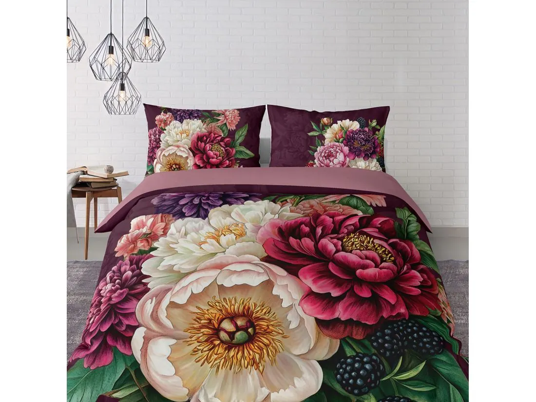 Przenieś do swojej sypialni elegancję i romantyzm dzięki pościeli bawełnianej 220x200 cm z dużą, efektowną kompozycją kwiatową. Bujne piwonie i dalie w kremowych, różowych, burgundowych oraz fioletowych odcieniach pięknie kontrastują z głębokim burgundowym tłem. Dodatkowe akcenty czarnych, dojrzałych jeżyn i zielonych liści nadają całości naturalnego i dekoracyjnego charakteru. Całość emanuje subtelnym vintage stylem, idealnym dla miłośników klasycznej florystyki.