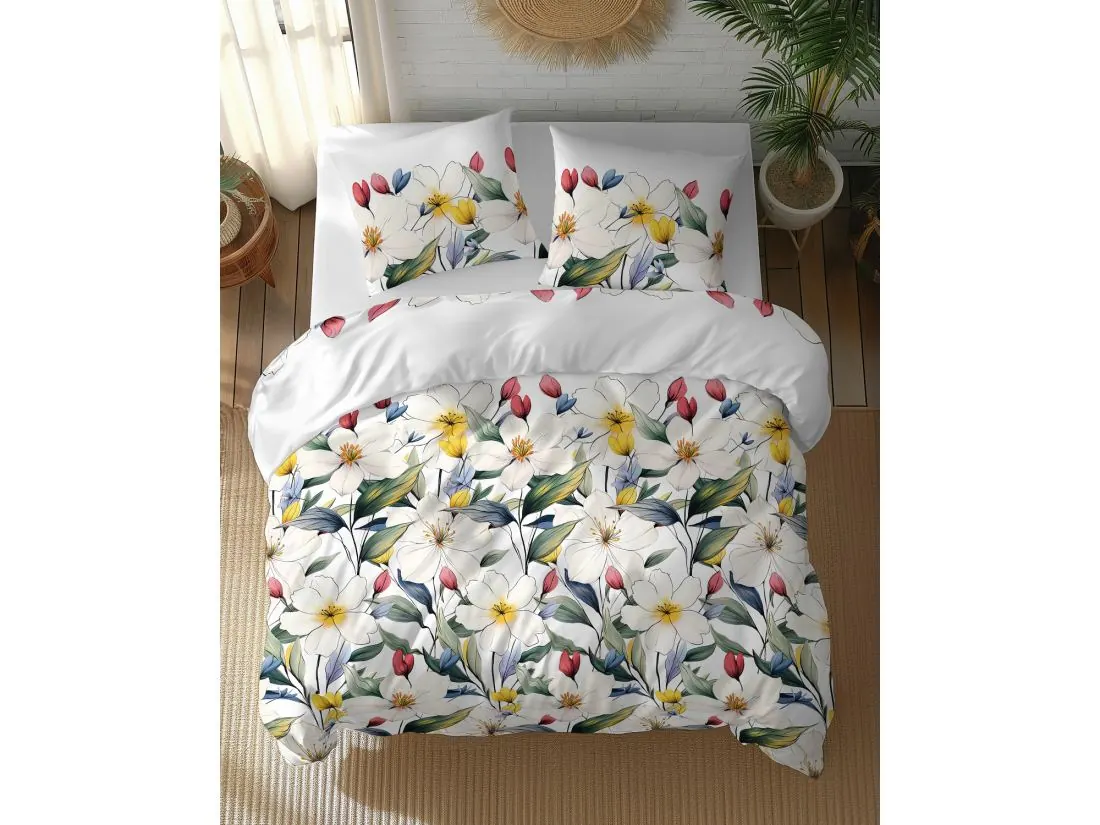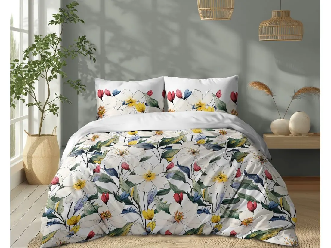 Pościel bawełniana z motywem kwitnącej łąki w białe kwiaty na jasnym tle to doskonały wybór dla miłośników natury, elegancji i komfortu. Ożywi Twoją sypialnię, dodając jej blasku, świeżości i przytulności – doskonała zarówno na prezent, jak i do codziennego użytku w domu.