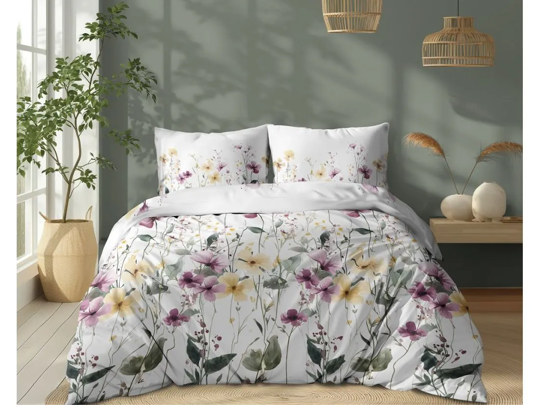 Ten wzór pościeli bawełnianej to delikatna, akwarelowa łąka pełna kwiatów w pastelowych odcieniach żółci, różu, fioletu i beżu. Wzór tworzony jest przez cienkie, subtelne łodygi, różnej wielkości płatki i drobne kwiatki tła, co daje niezwykle naturalny, lekki efekt. Kwiaty mają akcenty w subtelnych żółciach i pudrowych różach, a szare i zielone liście łagodnie przeplatają się w tle, tworząc harmonijną kompozycję.