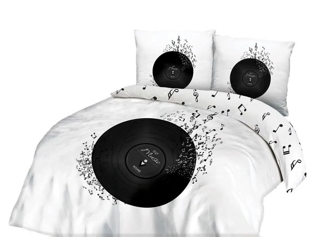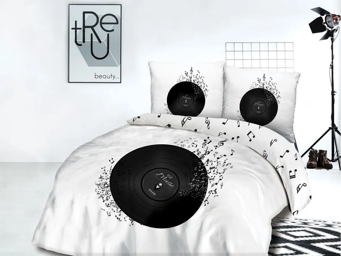 Niecodzienna pościel z bawełny w rozmiarze 220 x 200 cm z kolekcji Panelove wzór 61496/1, pościel posiada odpasowany wzór w nutki w biało czarnym kolorze.