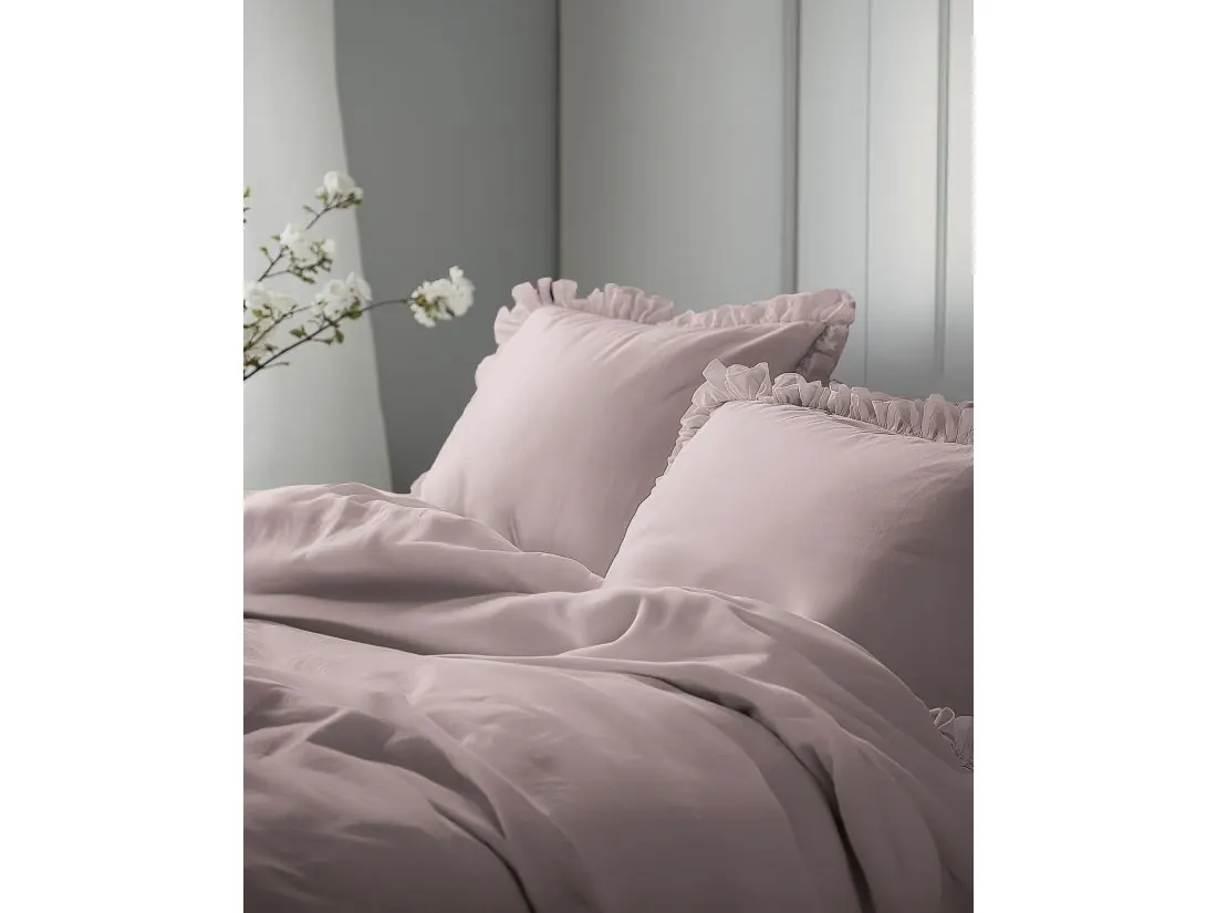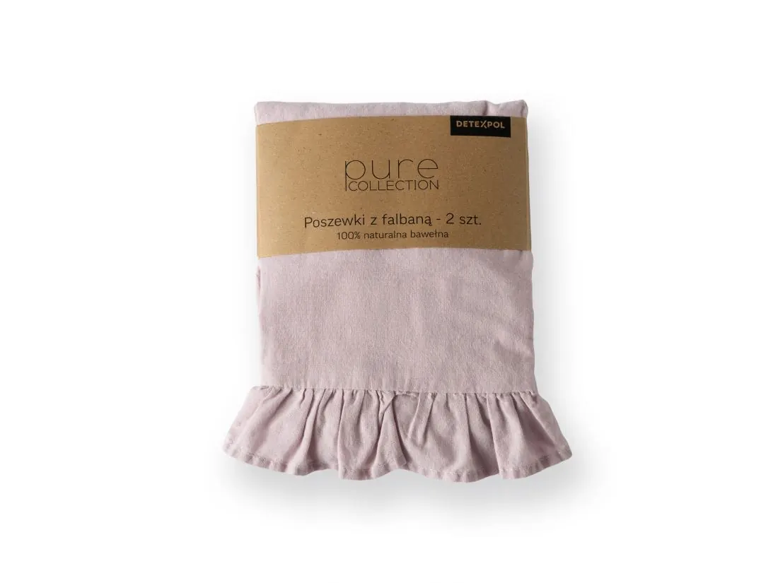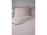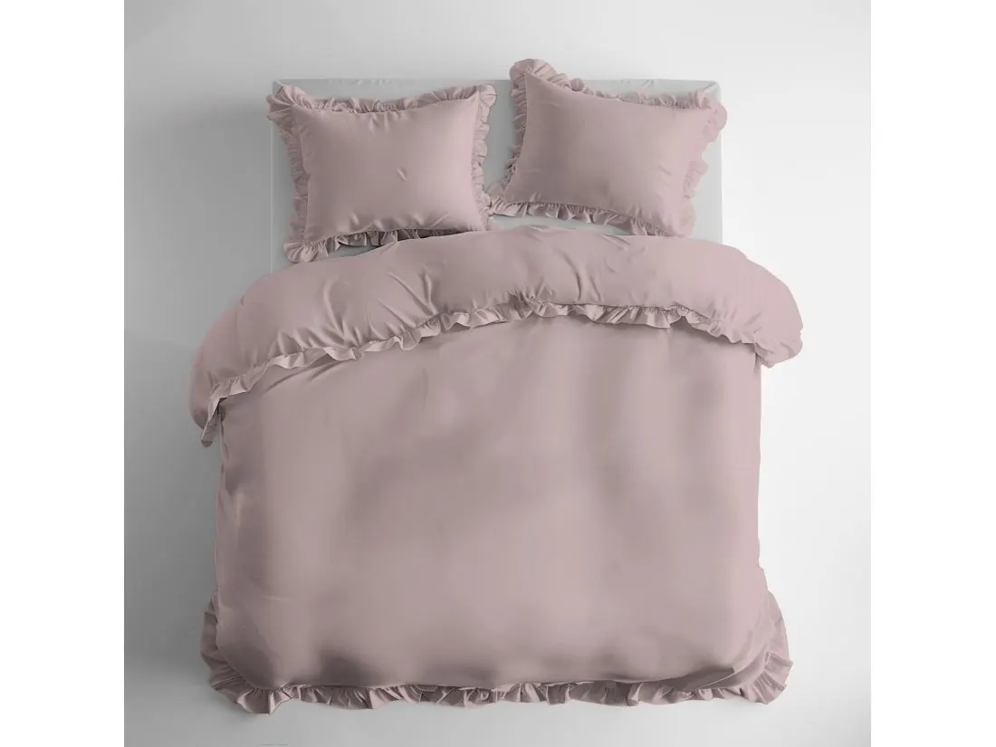 Dekoracyjne falbanki z czterech stron poszwy oraz na brzegach poszewki nadają zestawowi romantyczny, subtelny wygląd. Zapięcie na eleganckie guziki podkreśla naturalny i ponadczasowy charakter kompletu. Całość zapakowana jest w ekologiczny worek z tej samej tkaniny i w identycznym kolorze pudrowego różu, który świetnie sprawdzi się jako organizer lub worek na bieliznę.