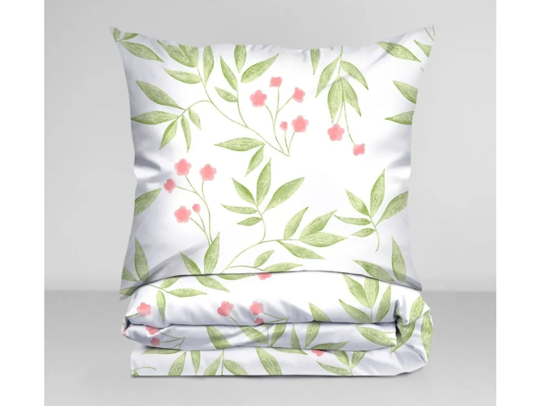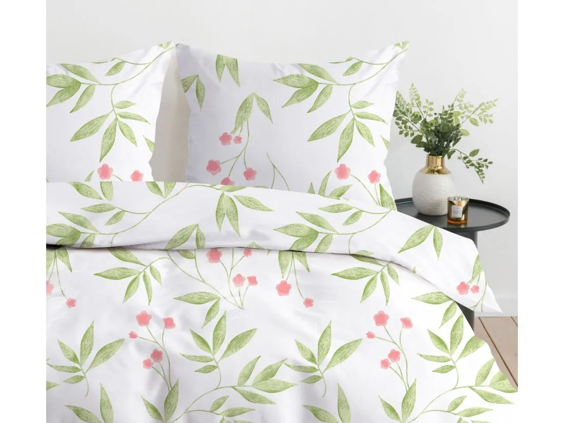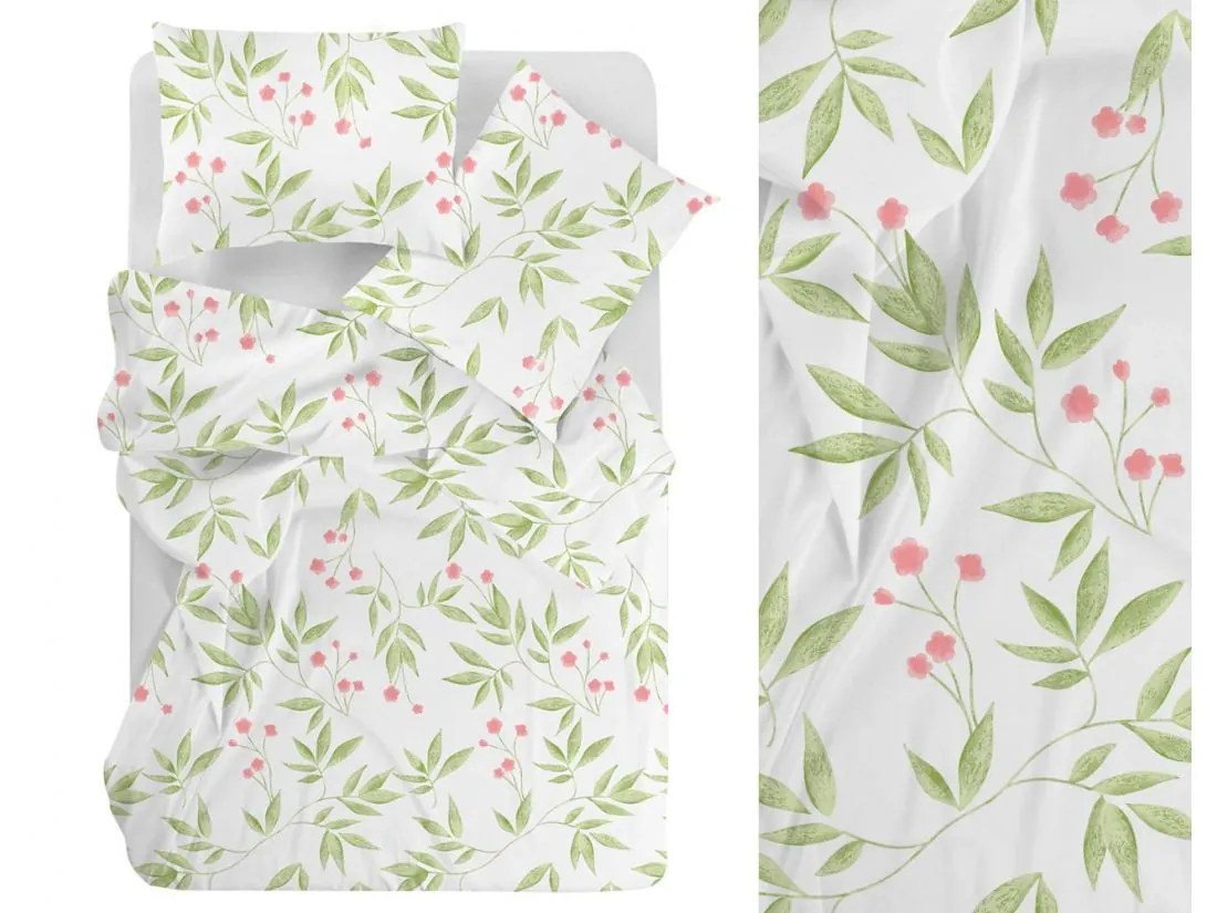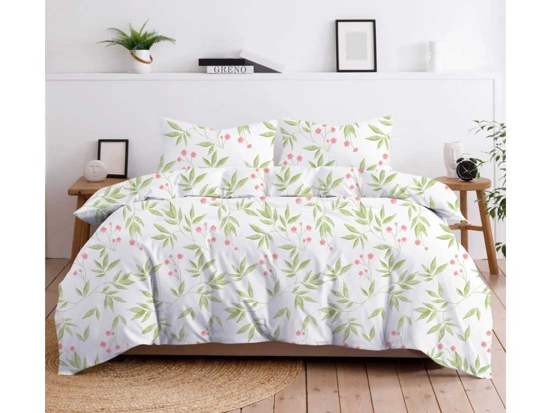 Pościel z delikatnym kwiatowym wzorem wprowadzi do Twojej sypialni wyjątkową, spokojną atmosferę. Na tle białej tkaniny znajdują się pastelowe, różowe kwiaty, otoczone delikatnymi, zielonymi liśćmi, które tworzą elegancki i naturalny wzór. Pościel jest lekka i świeża, idealna dla osób ceniących prostotę, ale również chcących dodać odrobinę romantyzmu do swojego wnętrza. Dzięki miękkiej bawełnie pościel zapewnia nie tylko estetyczny wygląd, ale także komfortowy sen każdej nocy. Wzór doskonale pasuje do wnętrz urządzonych w stylu skandynawskim, minimalistycznym czy romantycznym.