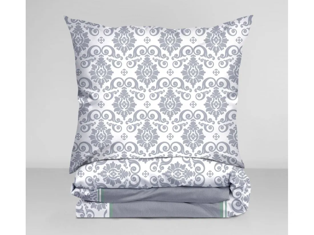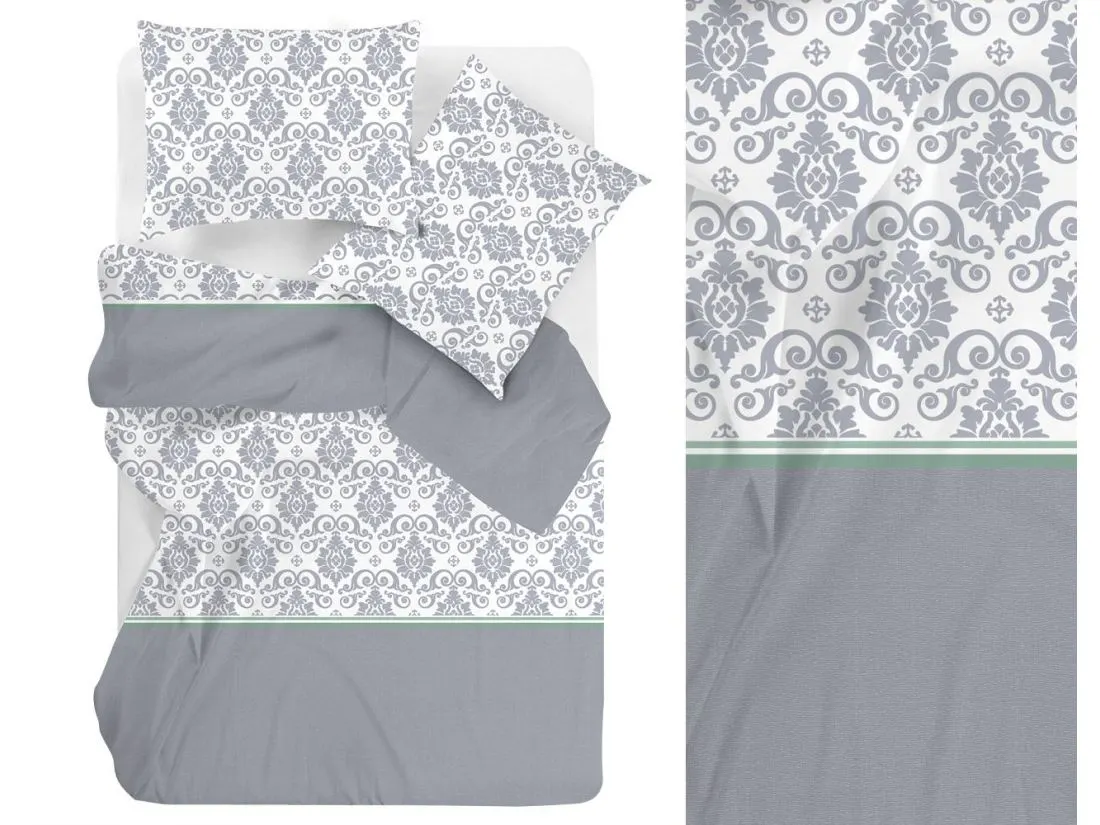Pościel z klasycznym wzorem damaskowym łączy elegancję z nowoczesnym akcentem. Na tle bieli znajduje się subtelny, szaro-biały wzór o finezyjnych kształtach, który nadaje całości wytworny i ponadczasowy charakter. W dolnej części pościeli znajduje się delikatna zielona linia, która dodaje świeżości i nowoczesności. Szary kolor tkaniny jest stonowany, tworząc idealne tło dla dekoracyjnego wzoru. Pościel wprowadzi do Twojego pokoju przytulną atmosferę, a jednocześnie wspaniale rozjaśni przestrzeń dzięki subtelnym kontrastom bieli i szarości.
