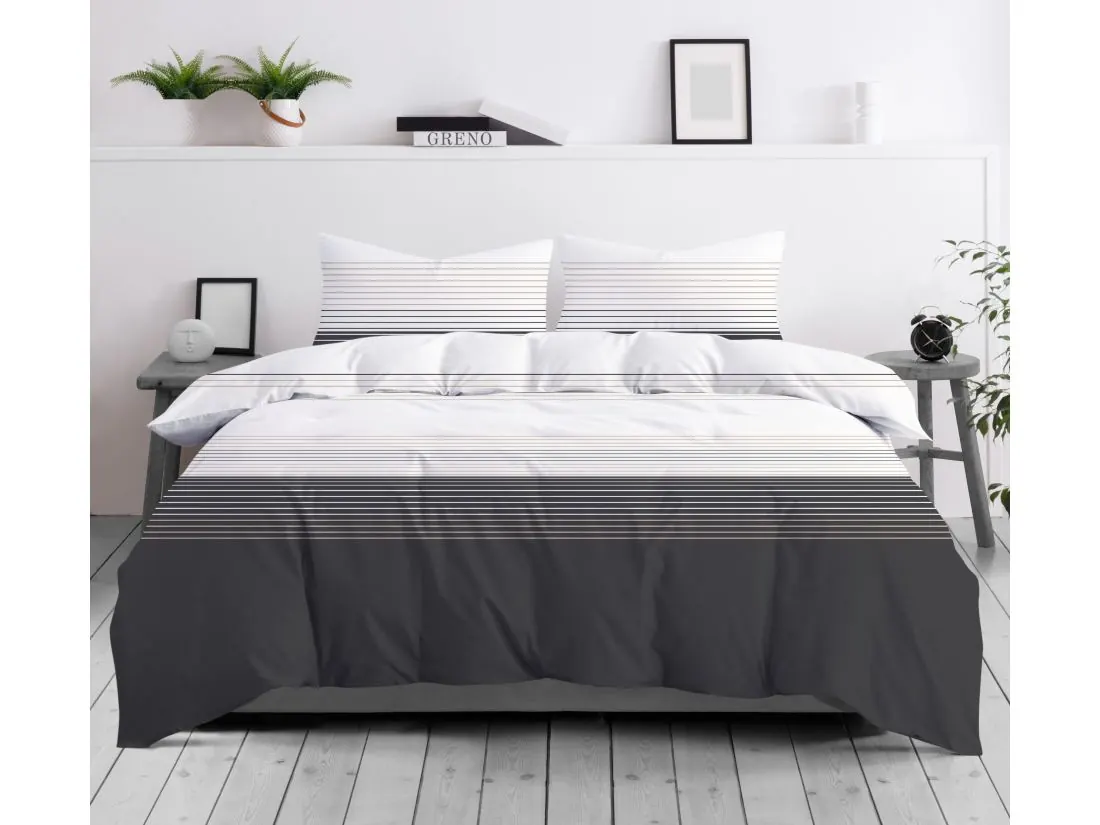 Nowoczesny wór pościeli Bianco nero w eleganckie pasy to doskonały wybór do każdej sypialni. Wzór składa się z cienkich, poziomych linii w różnych odcieniach szarości i bieli, które tworzą ciekawy efekt ombre. Jaśniejsze linie stopniowo przechodzą w ciemniejsze, dzięki czemu pościel wygląda stylowo i nadaje wnętrzu nowoczesny charakter. wzór jest uniwersalny – pasuje zarówno do klasycznych, jak i nowoczesnych aranżacji. Pościel jest wykonana z miękkiego materiału, który zapewnia komfortowy sen i łatwo się pierze. Idealna propozycja dla osób, które cenią prostotę, elegancję i funkcjonalność.
