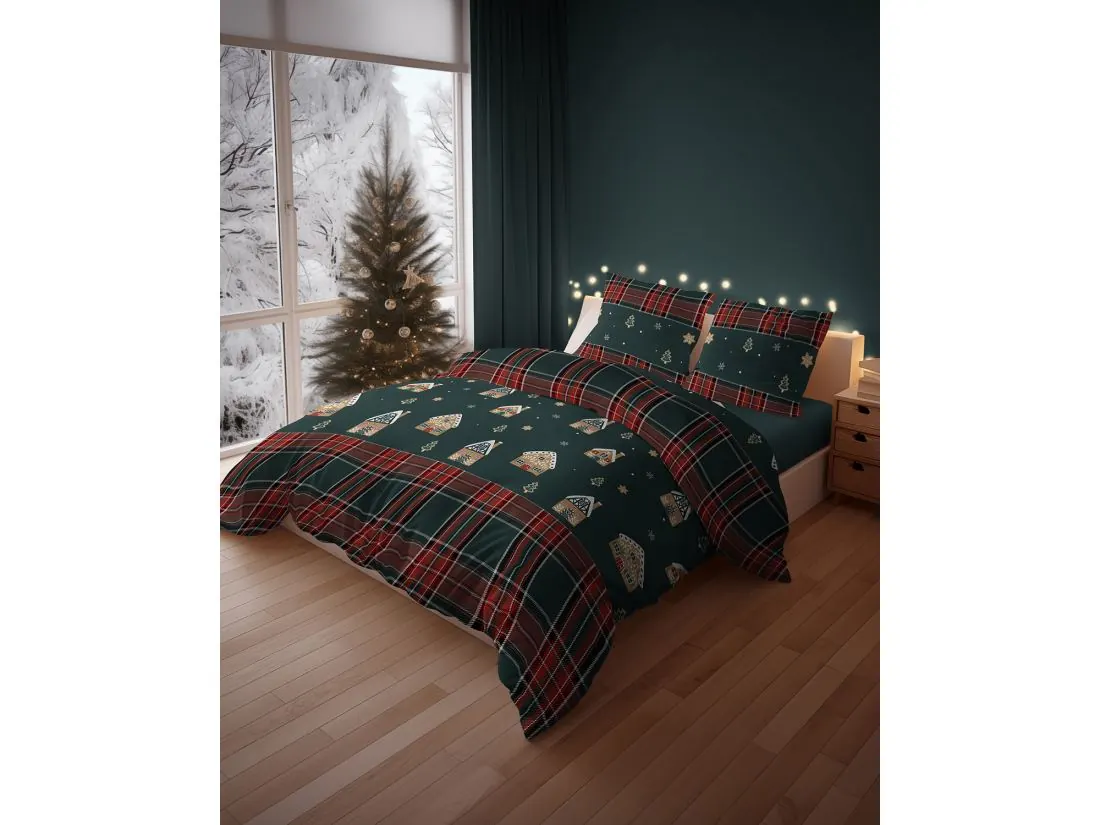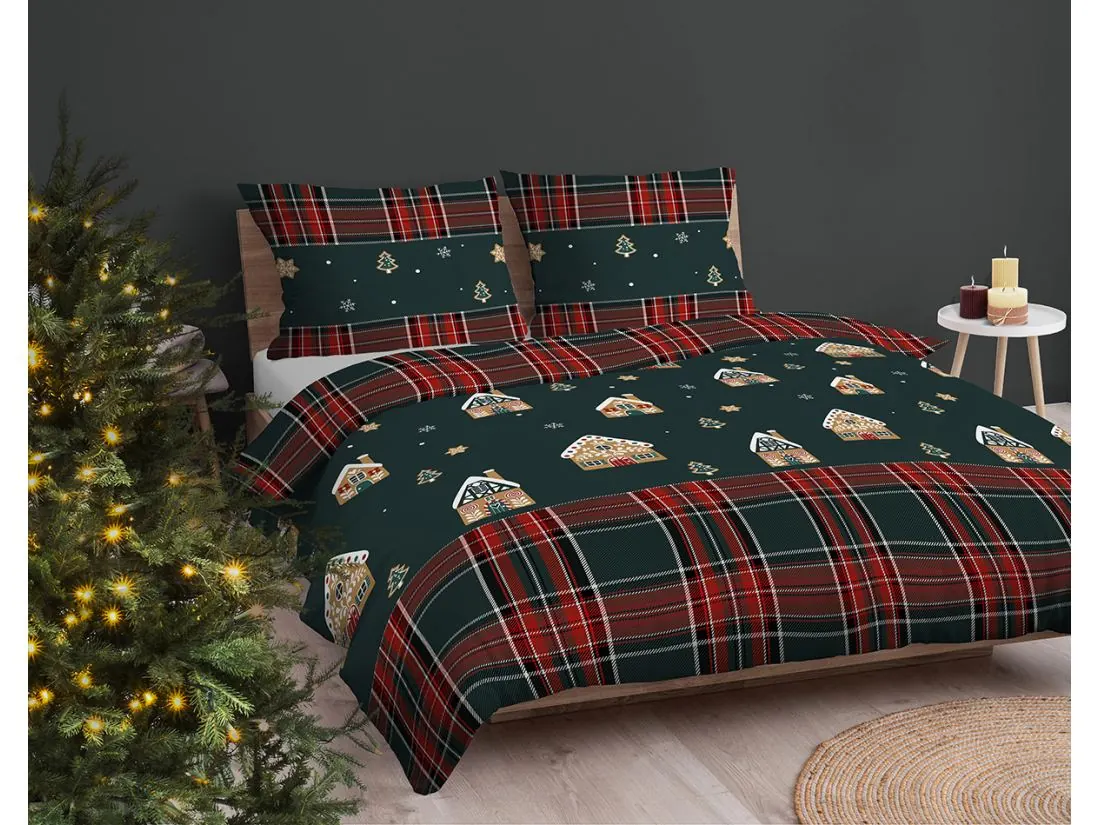 Brzegi pościeli zdobi szeroki pas w klasyczną czerwoną kratę, która pięknie kontrastuje z motywem piernikowym, podkreślając elegancję i tradycyjny charakter produktu. To połączenie ciemnej zieleni z ciepłym wzorem daje bajkową atmosferę i wyjątkowy urok w każdym wnętrzu.