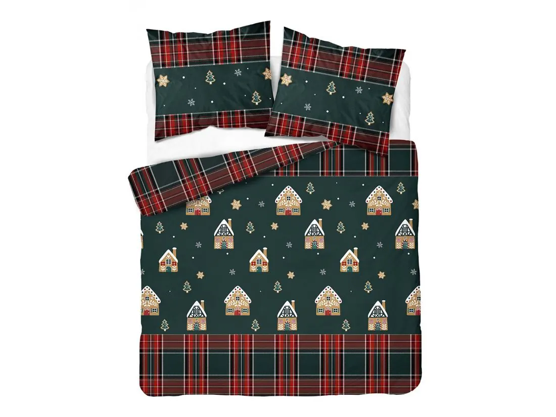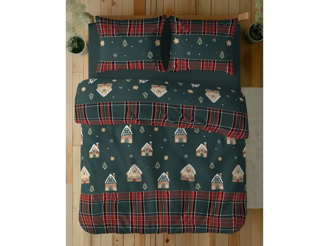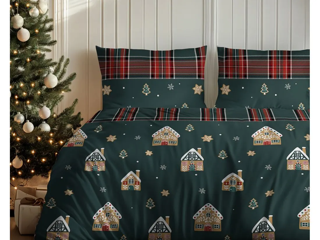Wzór pościeli przywołuje rodzinny, zimowy klimat Bożego Narodzenia z motywami piernikowych domków, małych choinek, śnieżynek oraz gwiazdek przypominających korzenne ciasteczka, osadzonych na głębokim, butelkowozielonym tle.