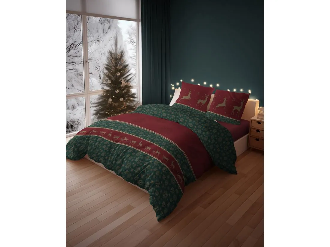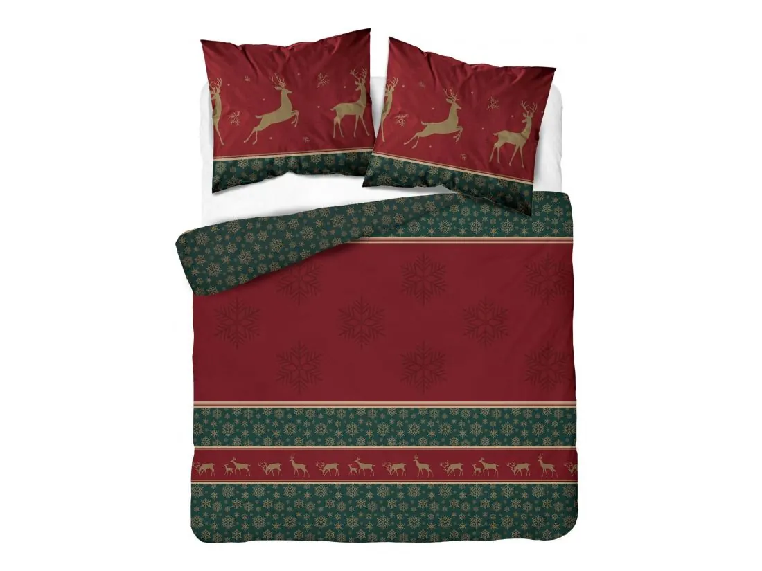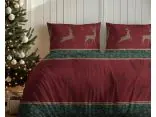 Wzór tej pościeli świątecznej został stworzony z myślą o eleganckim, tradycyjnym wystroju na zimowe wieczory. Dominującym motywem jest głęboka, ciemnoczerwona kolorystyka ozdobiona subtelnymi, powtarzalnymi wzorami śnieżynek, która nadaje tkaninie klasy i przytulności. Po środku oraz na poszewkach pojawiają się złote sylwetki reniferów i płatków śniegu, tworząc wyjątkową, bożonarodzeniową atmosferę.