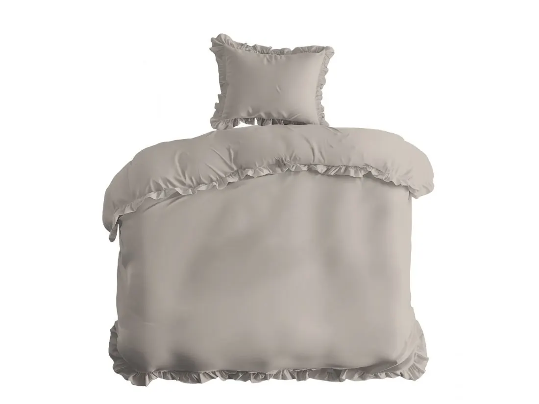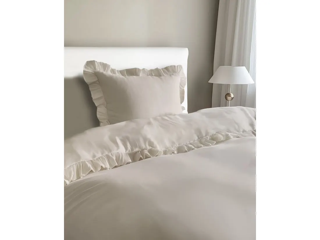 Wzór pościeli jest gładki, bez nadruków czy grafik. Jej ozdobą są wyłącznie falbanki, które nadają całości romantycznego, delikatnego i eleganckiego wyglądu.