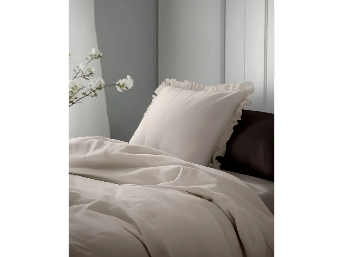 Pościel utrzymana jest w eleganckim, jasnobeżowym odcieniu, który wnosi do sypialni ciepło, spokój i subtelną harmonię. Beż to kolor wyjątkowo uniwersalny — świetnie pasuje do drewnianych mebli, naturalnych dekoracji, bieli oraz nowoczesnych, skandynawskich aranżacji.