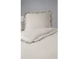 Delikatny, dekoracyjny charakter nadają jej falbanki wszyte na brzegach poszwy i poszewki, a klasyczne guziki podkreślają naturalny, rustykalny styl całości. Zestaw zapakowany jest w ekologiczny worek wykonany z tej samej tkaniny i w tym samym kolorze.