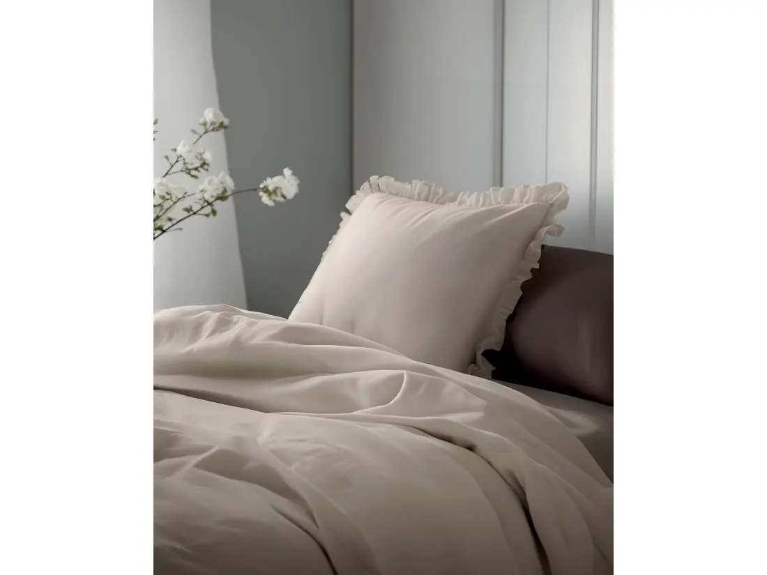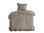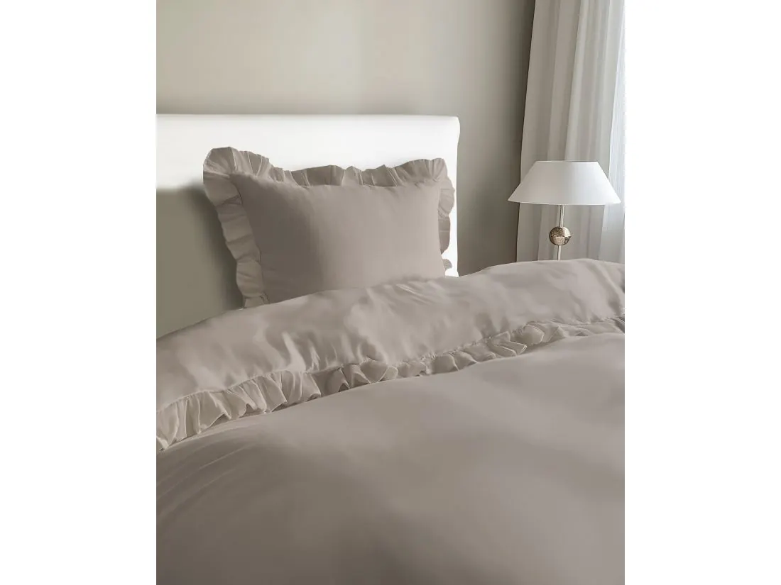 Pościel utrzymana jest w jednolitym, eleganckim kolorze taupe — odcieniu łączącym w sobie szarość, beż i delikatny brąz. Barwa ta jest wyjątkowo uniwersalna i ponadczasowa. Wzór jest gładki, bez nadruków, a subtelne falbanki podkreślają romantyczny, naturalny charakter kompletu.