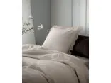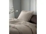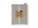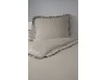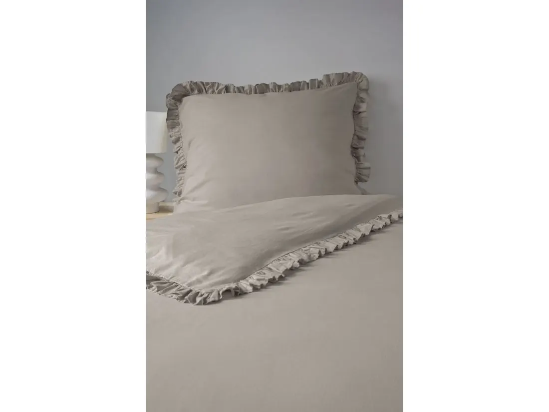 Pościel ma dekoracyjne falbanki z czterech stron poszwy oraz na brzegach poszewki, a zamknięcie na klasyczne guziki dodaje całości naturalnego, rustykalnego uroku. Zestaw zapakowany jest w ekologiczny worek wykonany z tego samego materiału i w tym samym kolorze taupe — idealny do późniejszego wykorzystania jako worek na bieliznę lub organizer.